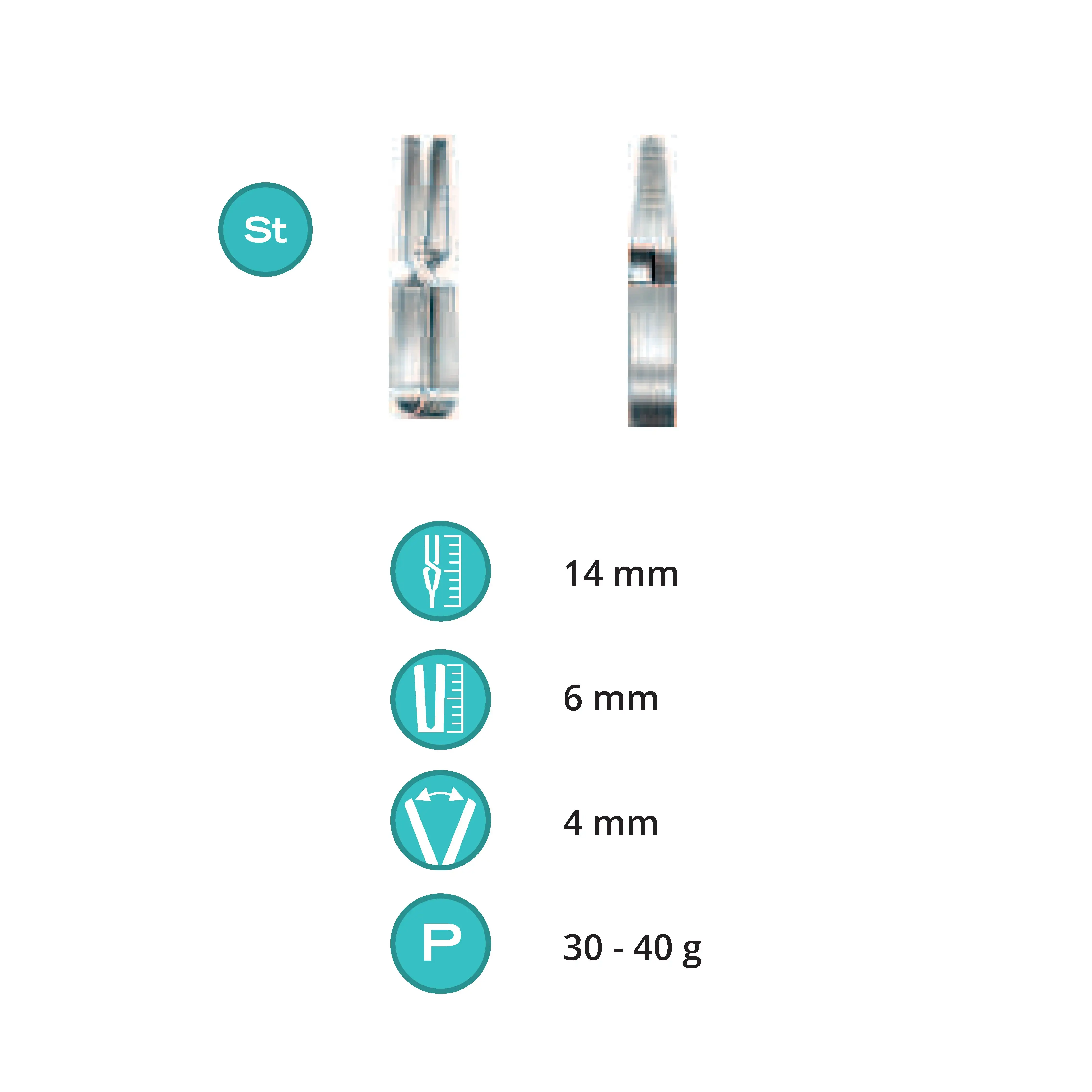 Length 14 mm, working area 6 mm, opening range 4 mm, Pressure 30-40 g