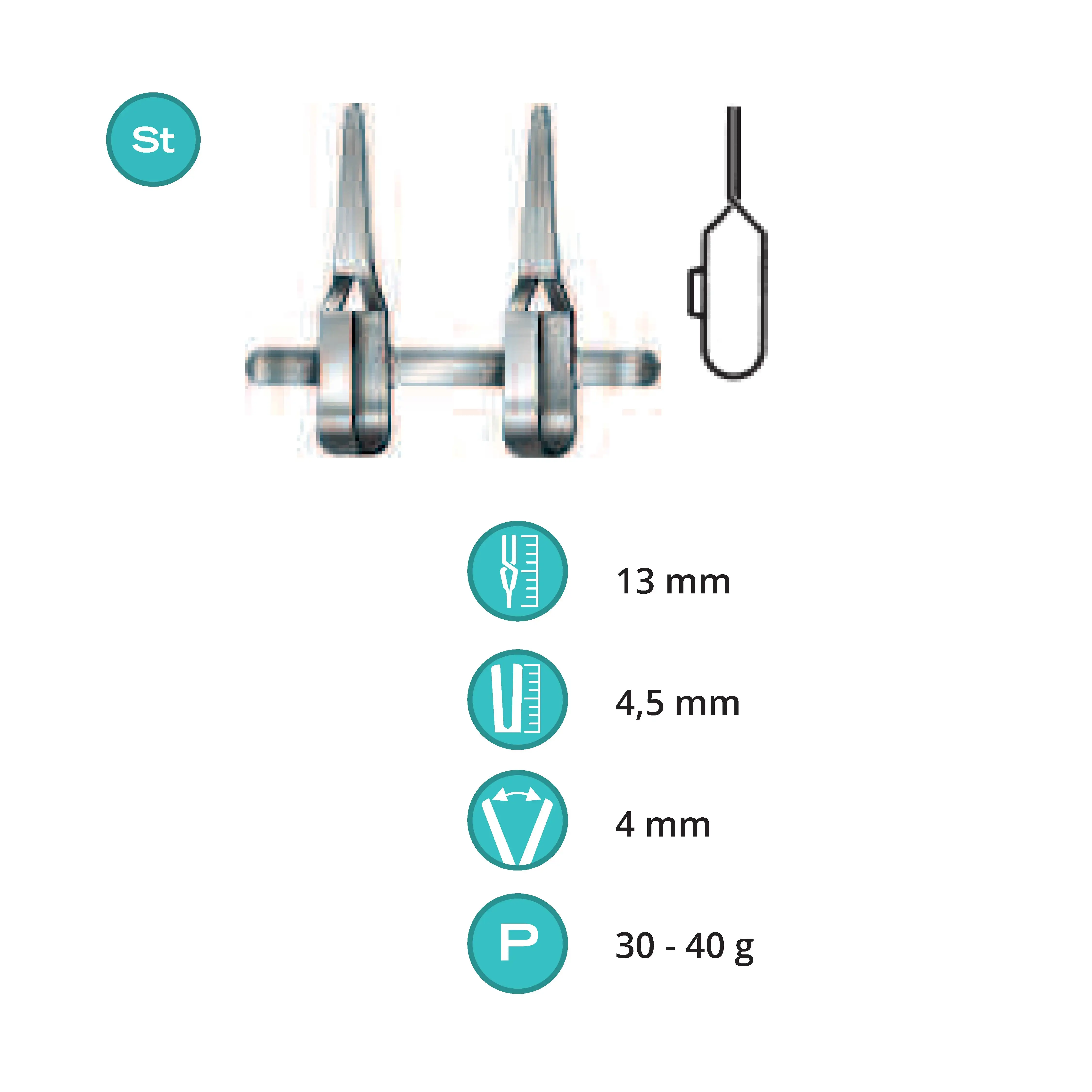 Length 13 mm, working area 4.5 mm, opening range 4 mm, Pressure 30-40 g