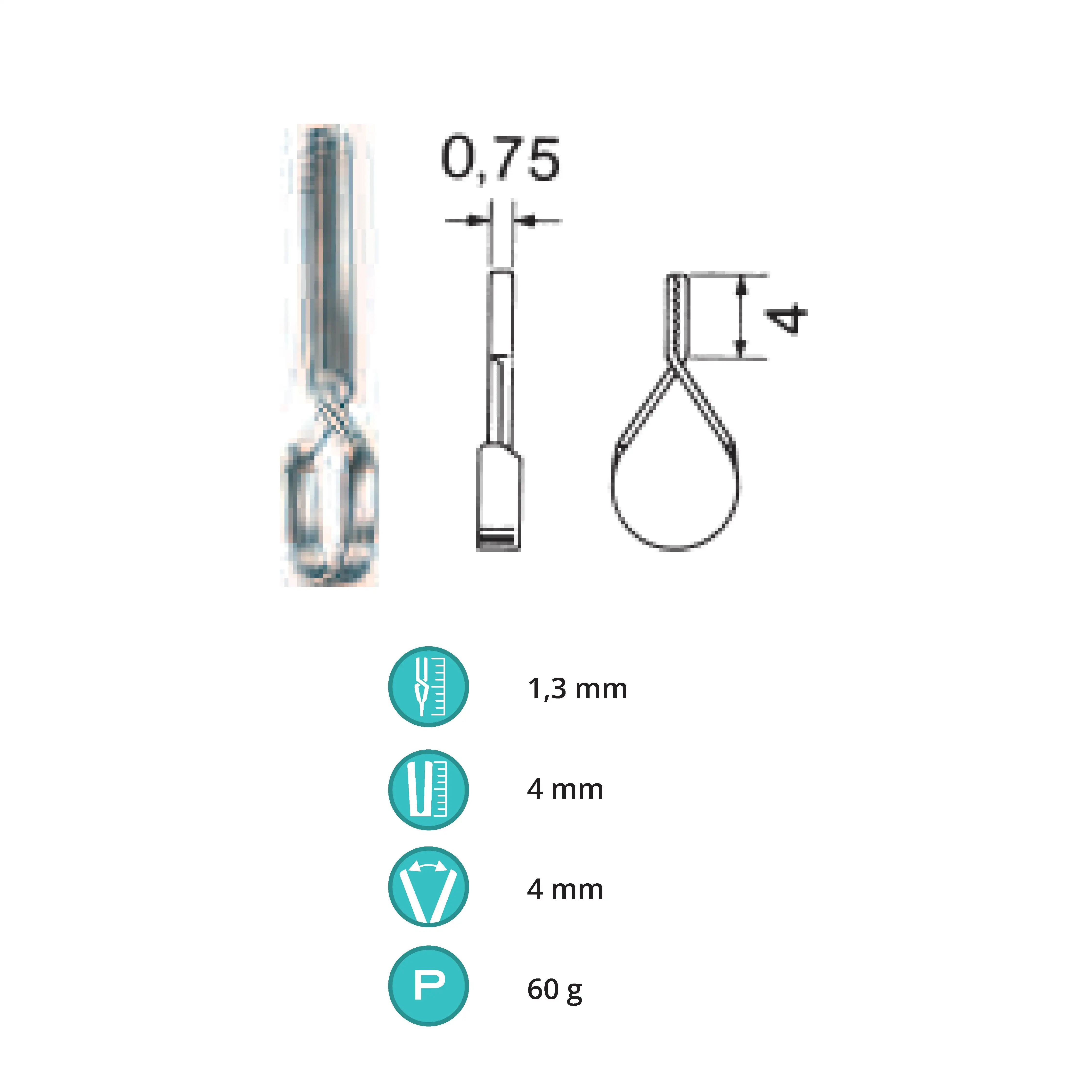 Length 1.3 cm, working area 4 mm, opening range 4 mm, Pressure 60 g, Tip width 0.75 mm