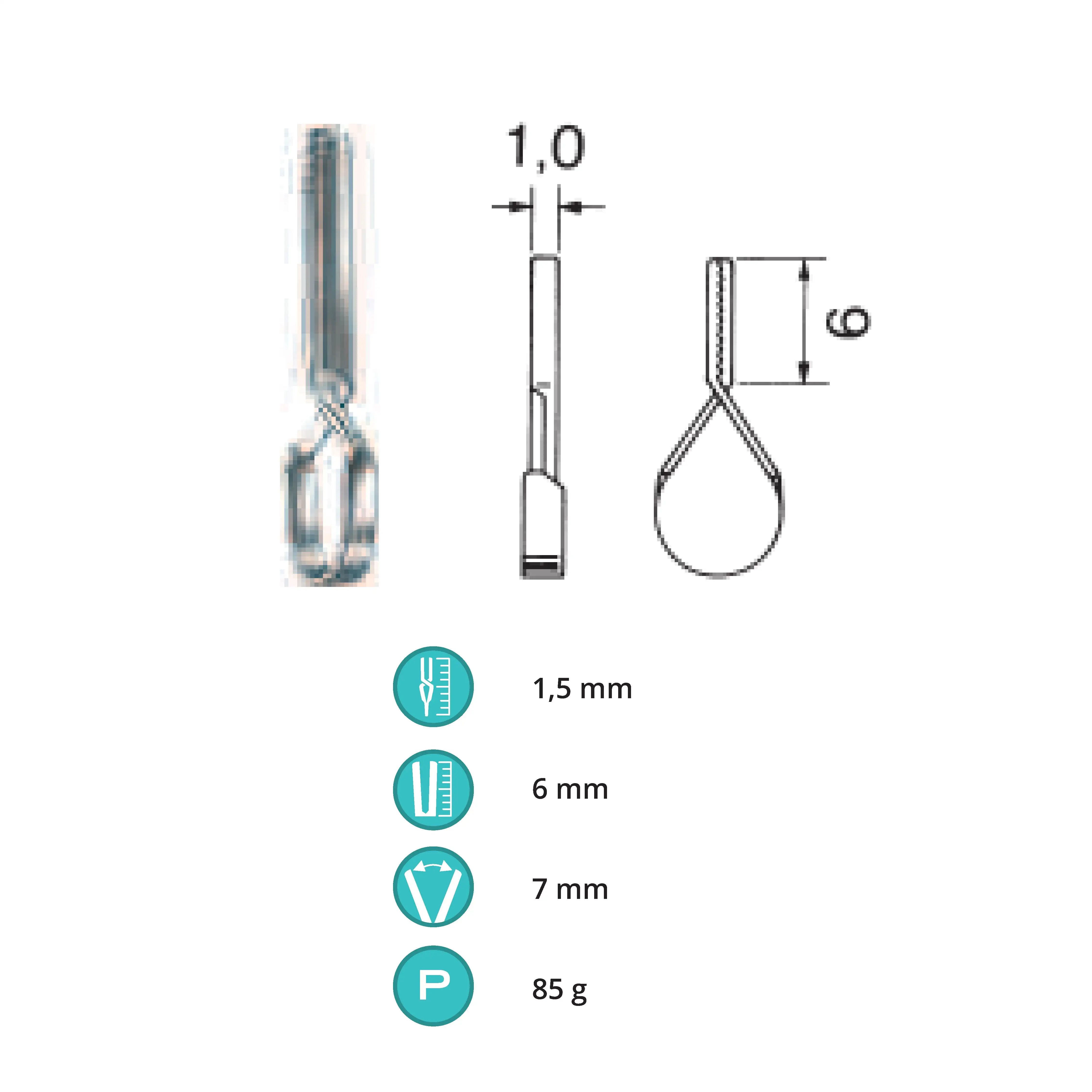 Length 1.5 cm, working area 6 mm, opening range 5 mm, Pressure 85 g, Tip width 1 mm