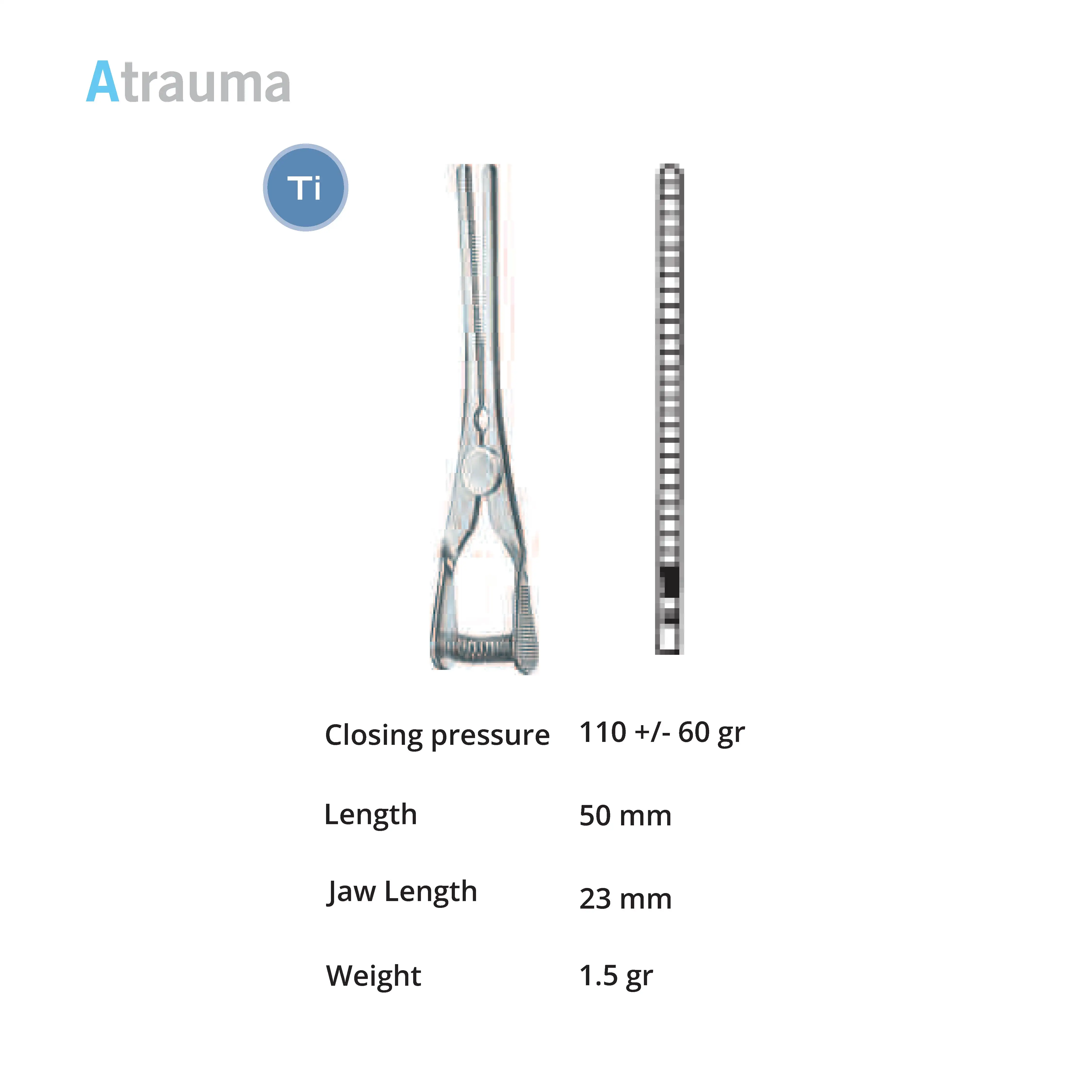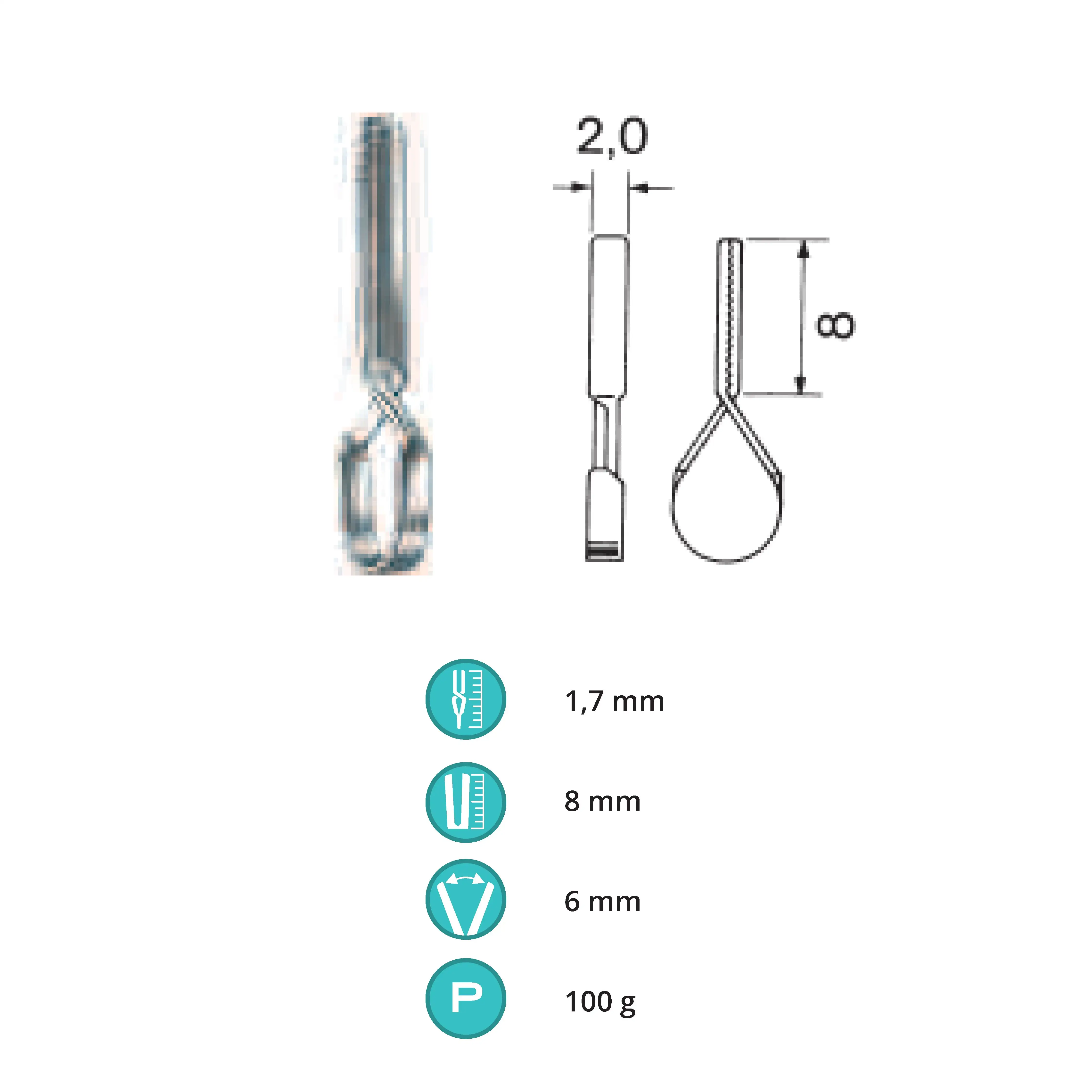 Length 1.7 cm, working area 8 mm, opening range 6 mm, Pressure 100 g, Tip width 2 mm