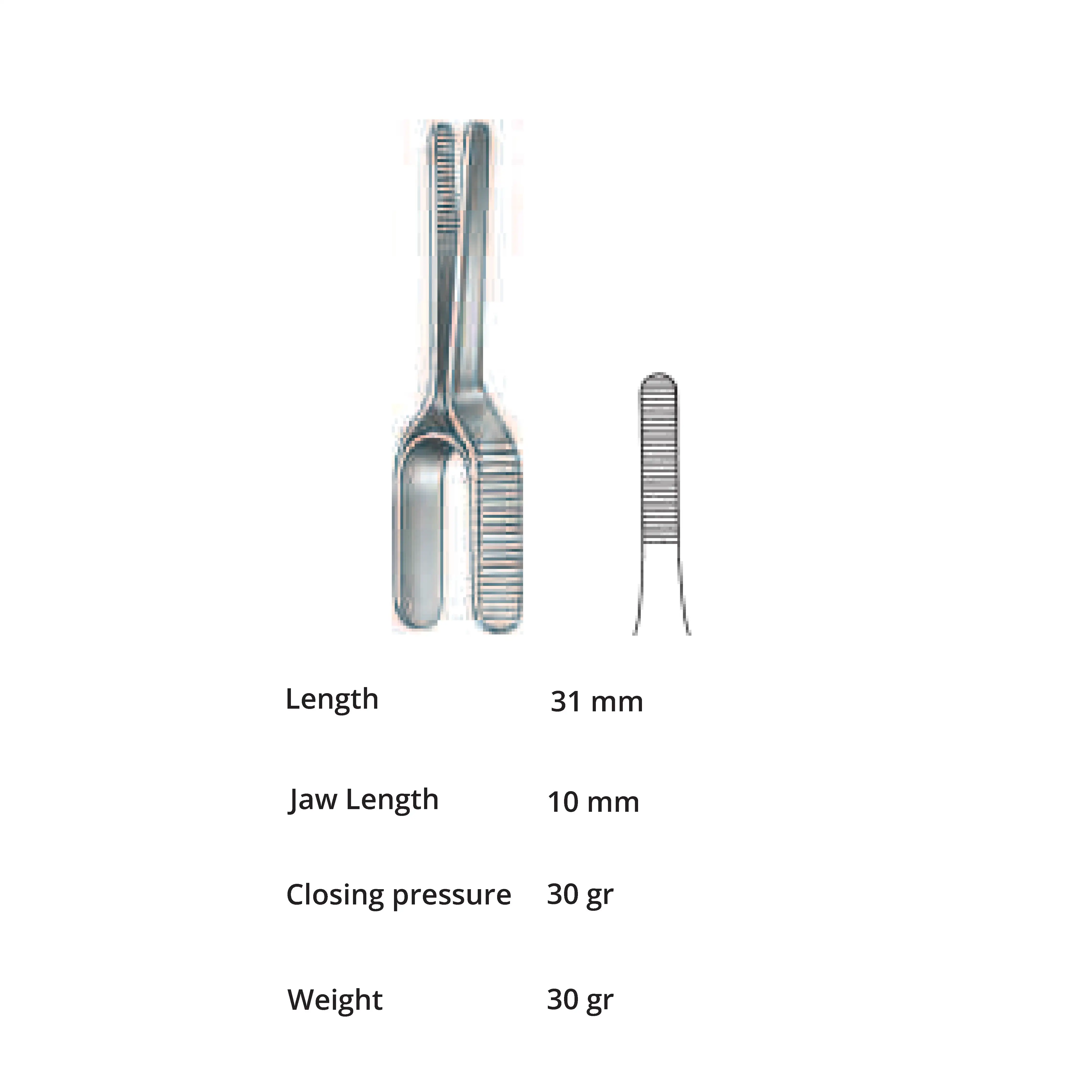 Length 31 mm, jaw length 10 mm, Pressure 30 g, weight 30 g