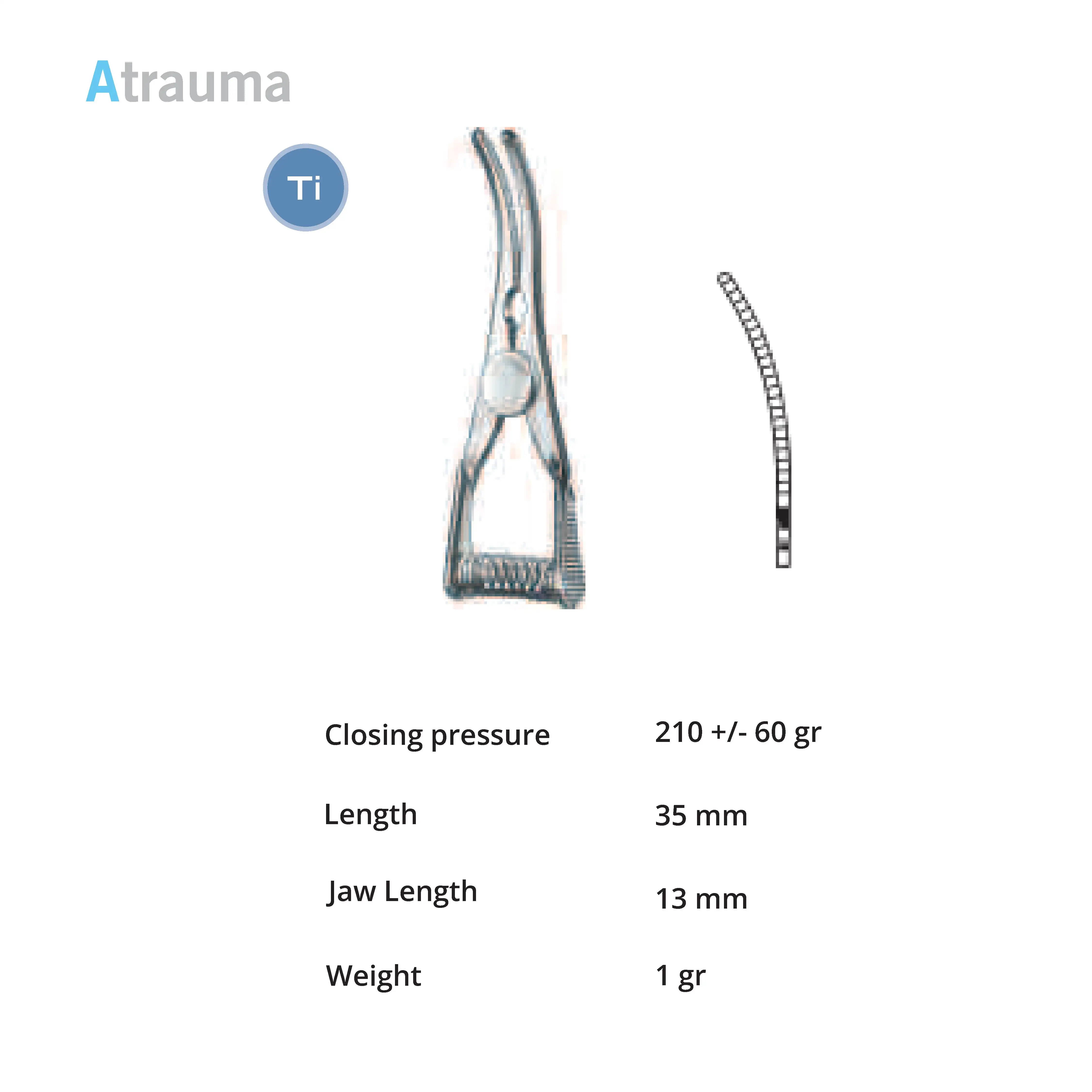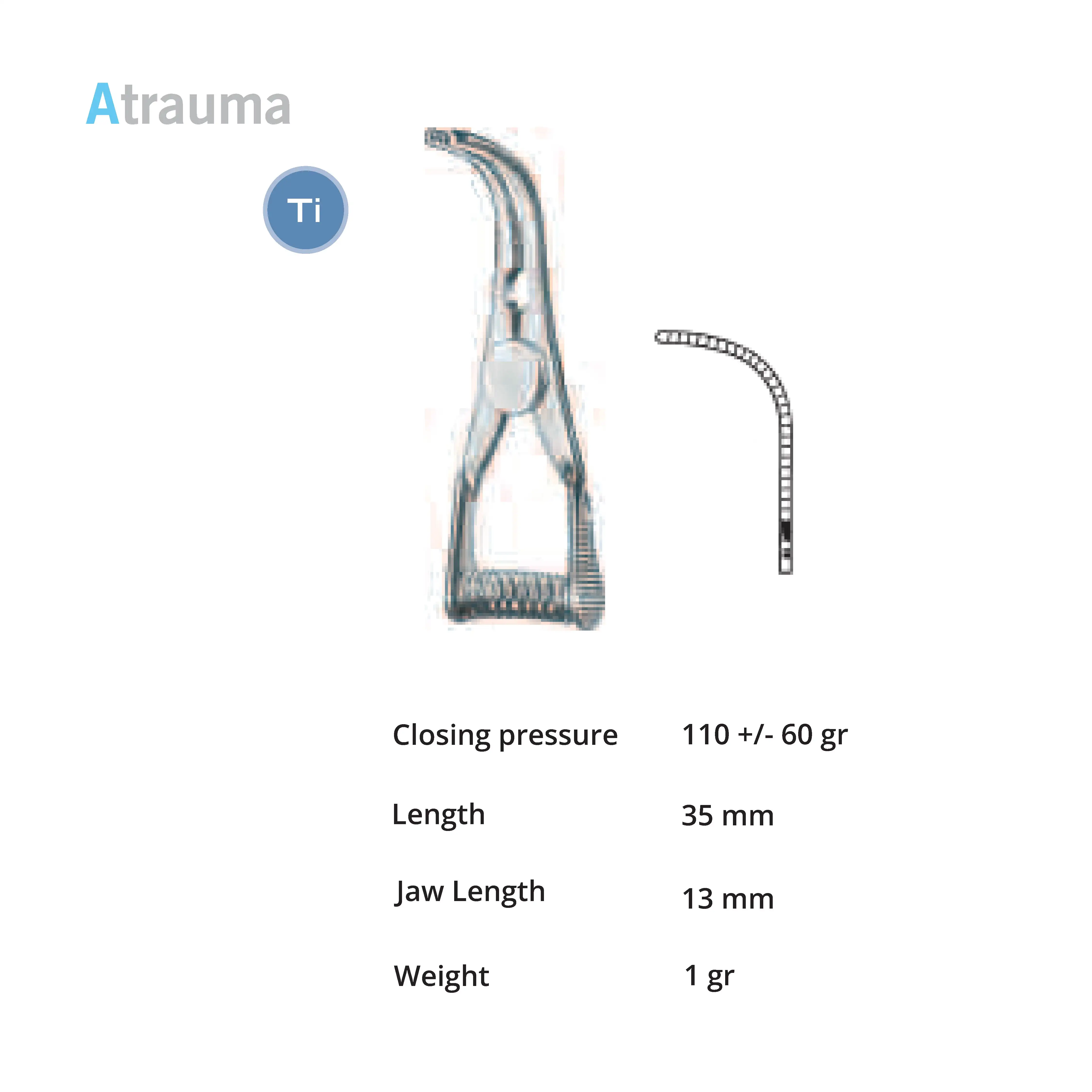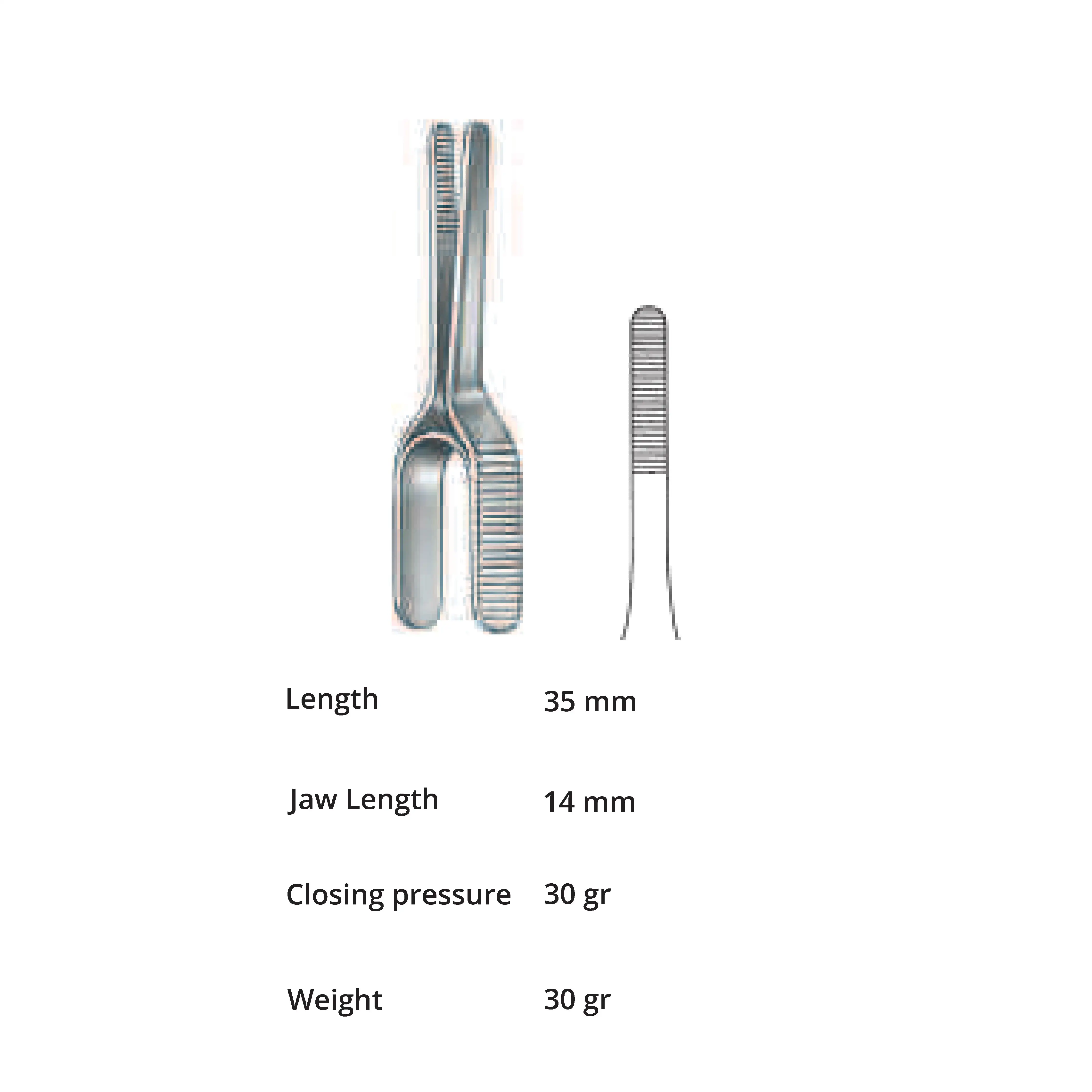 Length 35 mm, jaw length 14 mm, Pressure 30 g, weight 30 g