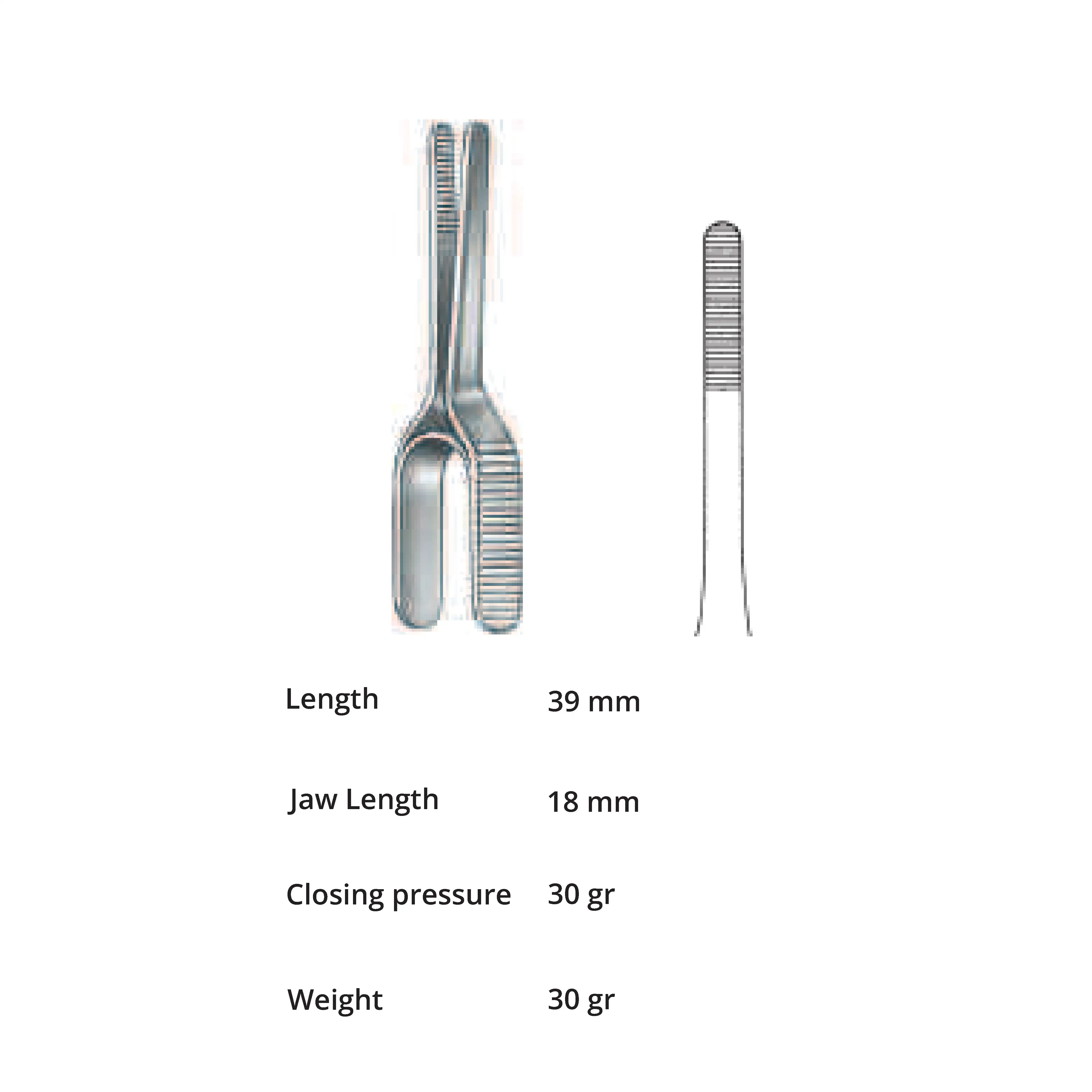 Length 39 mm, jaw length 18 mm, Pressure 30 g, weight 30 g