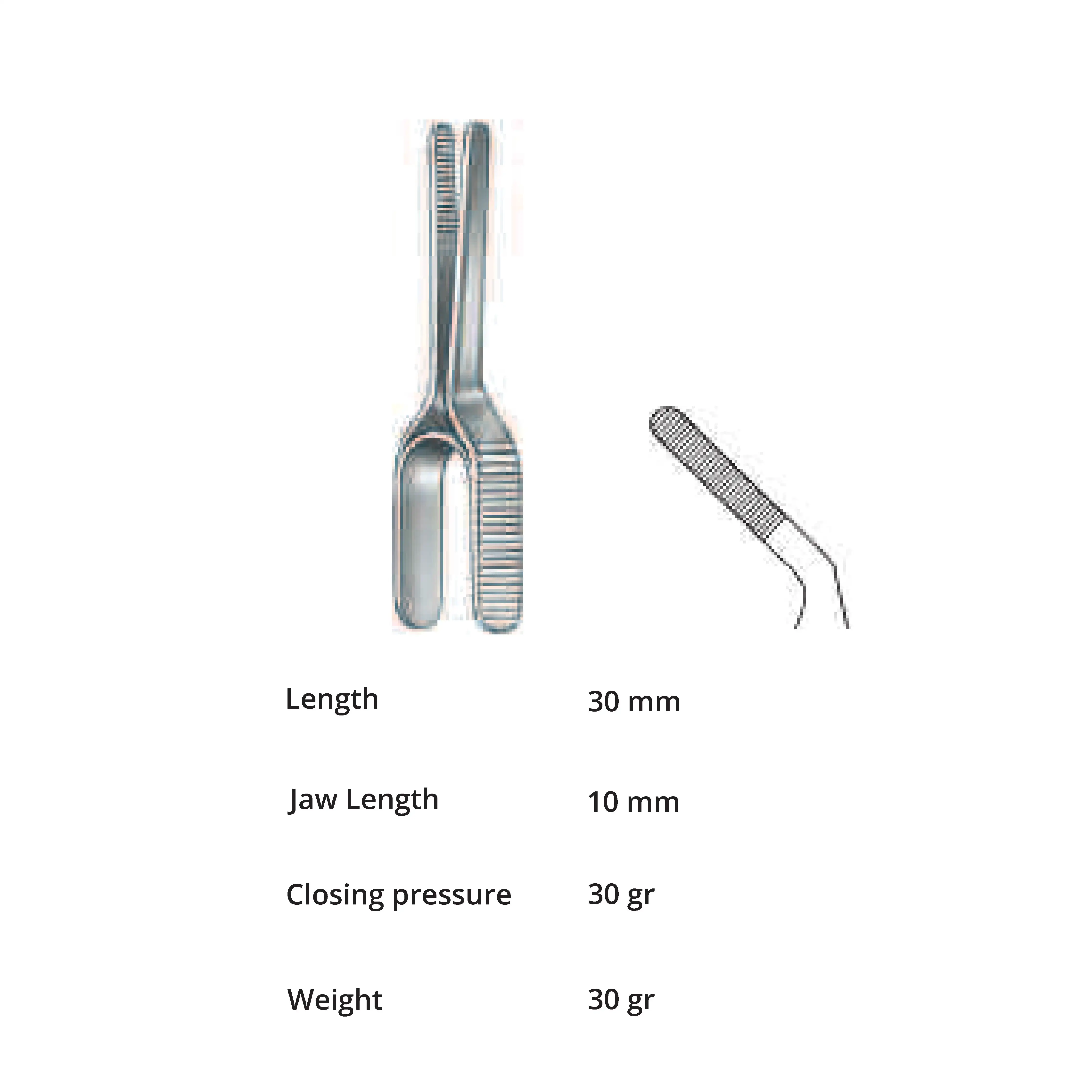 Length 30 mm, jaw length 10 mm, Pressure 30 g, weight 30 g