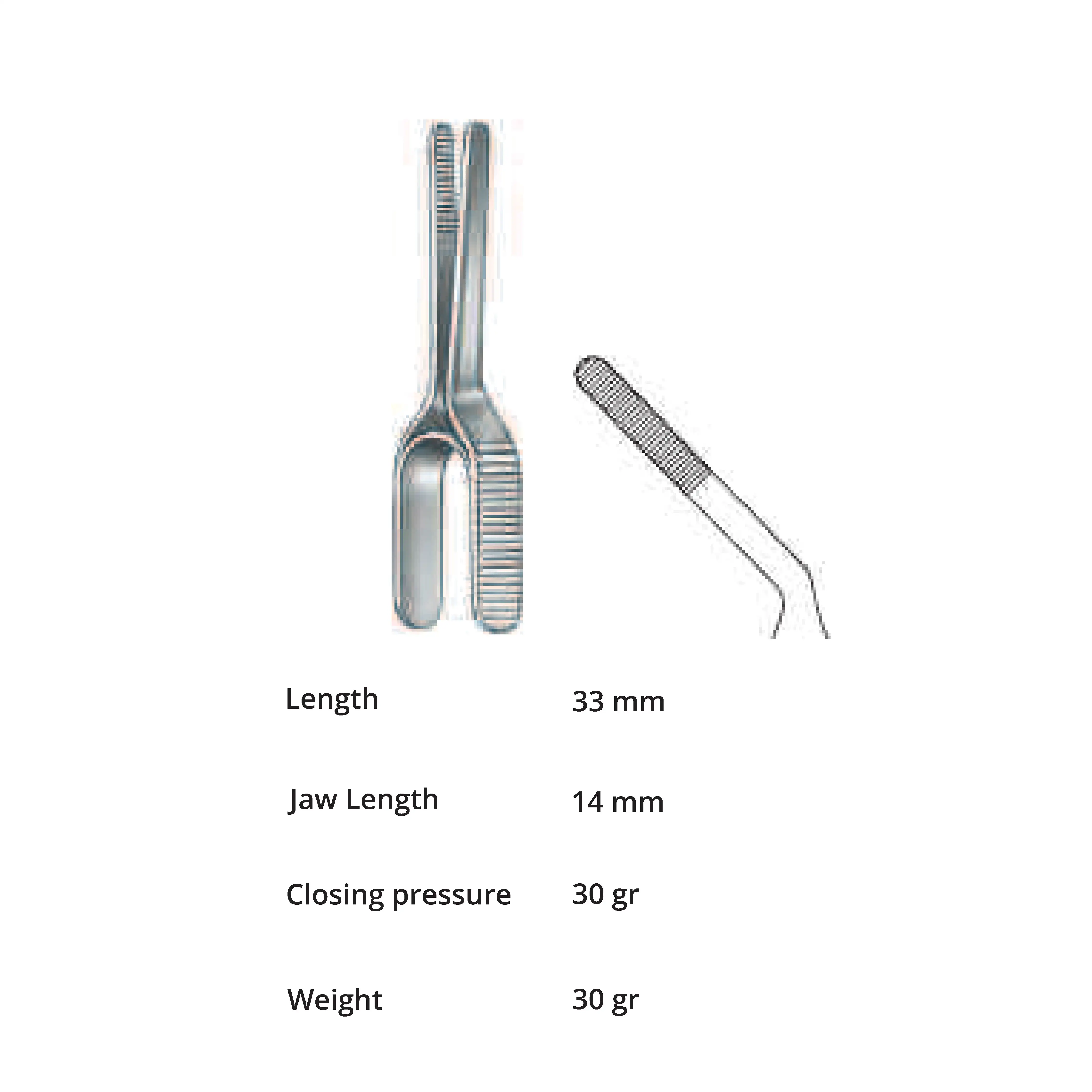 Length 33 mm, jaw length 14 mm, Pressure 30 g, weight 30 g