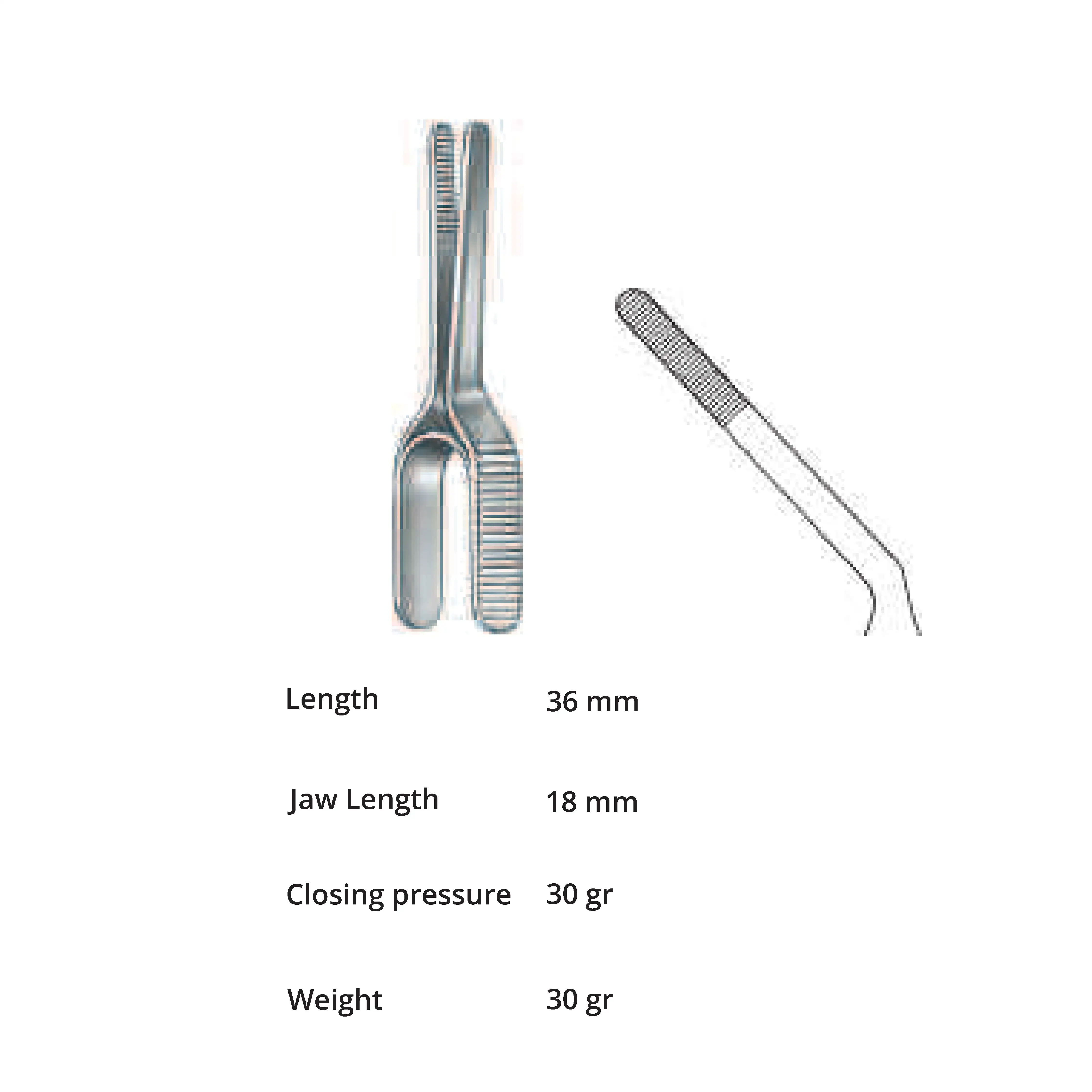 Length 36 mm, jaw length 18 mm, Pressure 30 g, weight 30 g