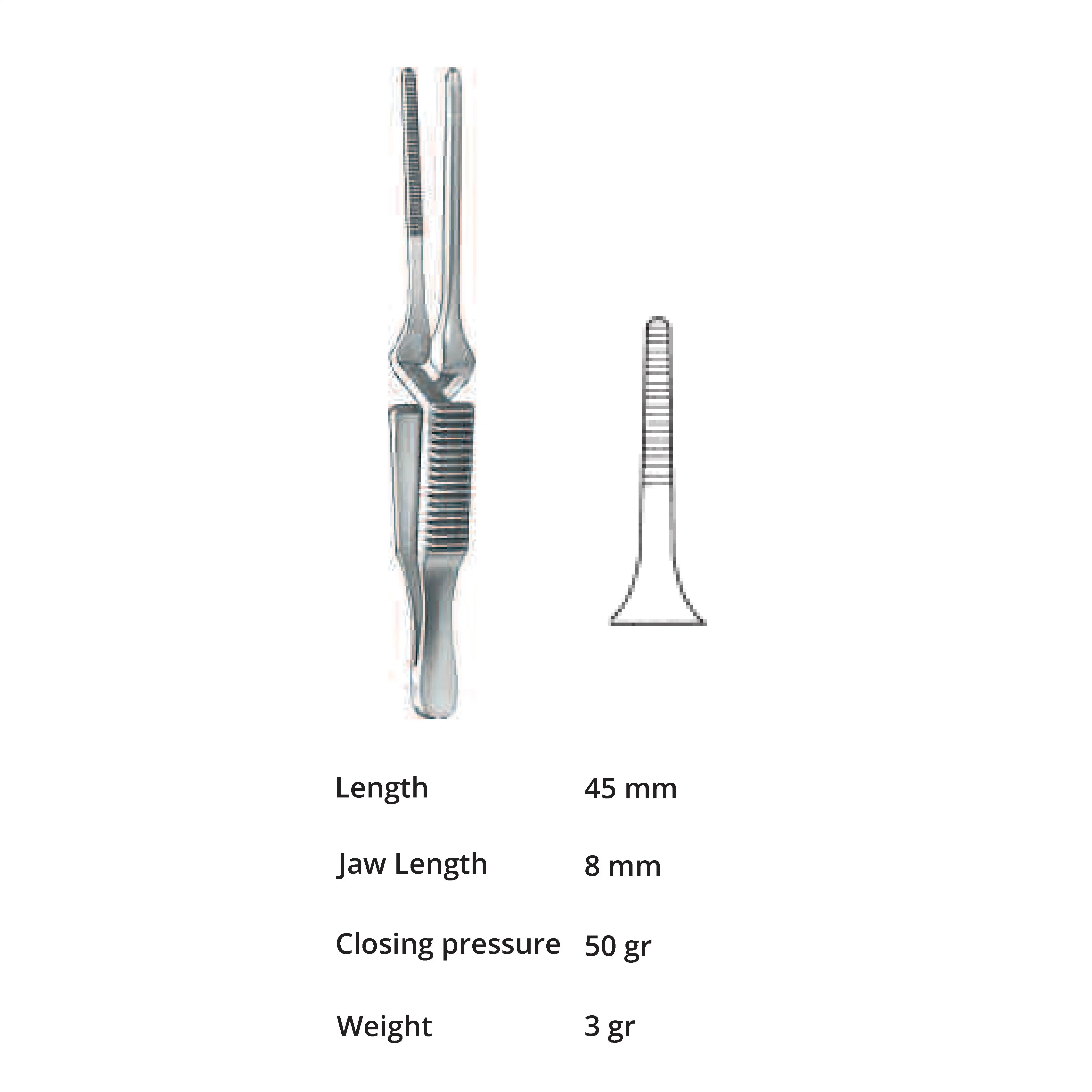 Length 45 mm, jaw length 8 mm, Pressure 50 g, weight 3 g