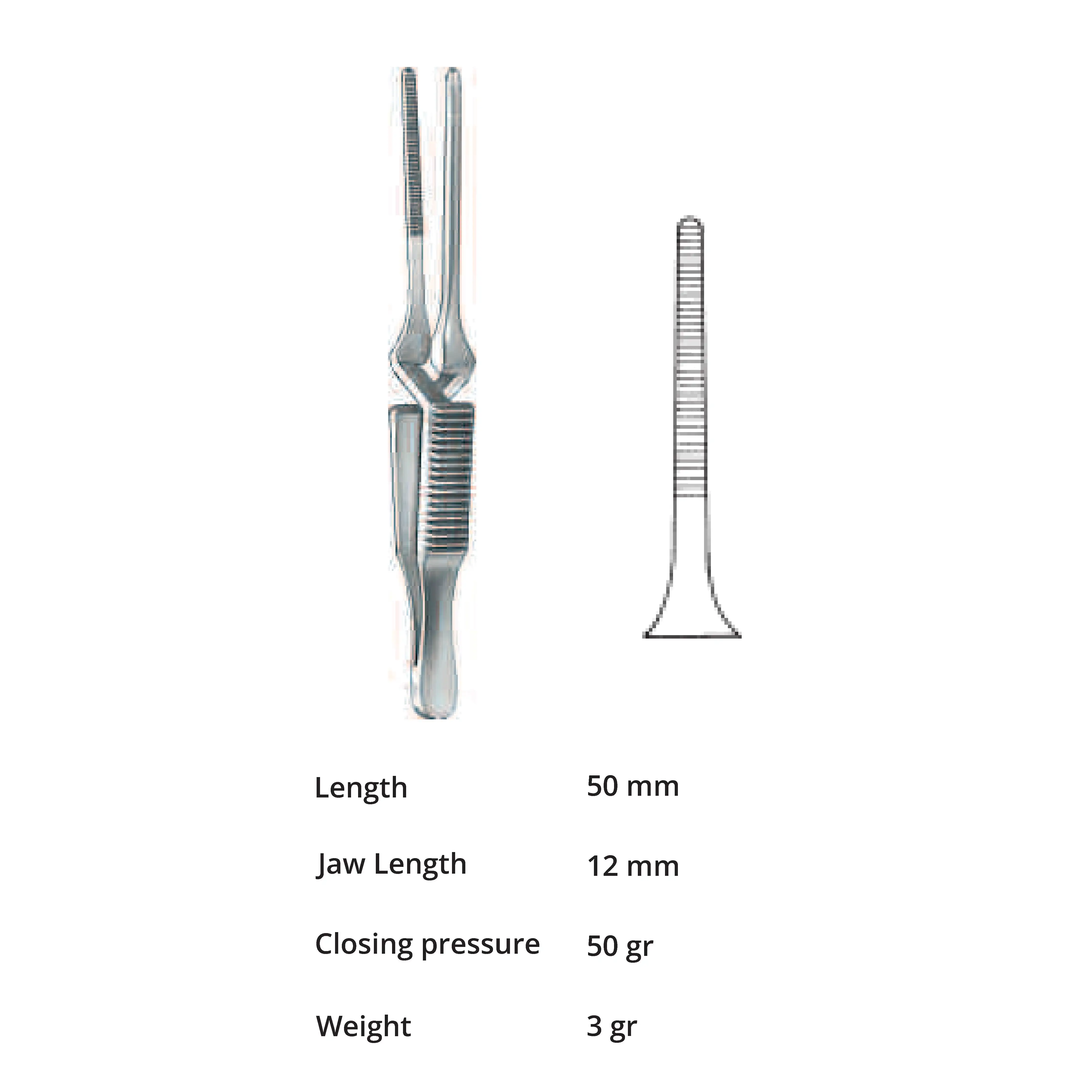 Length 50 mm, jaw length 12 mm, Pressure 50 g, weight 3 g