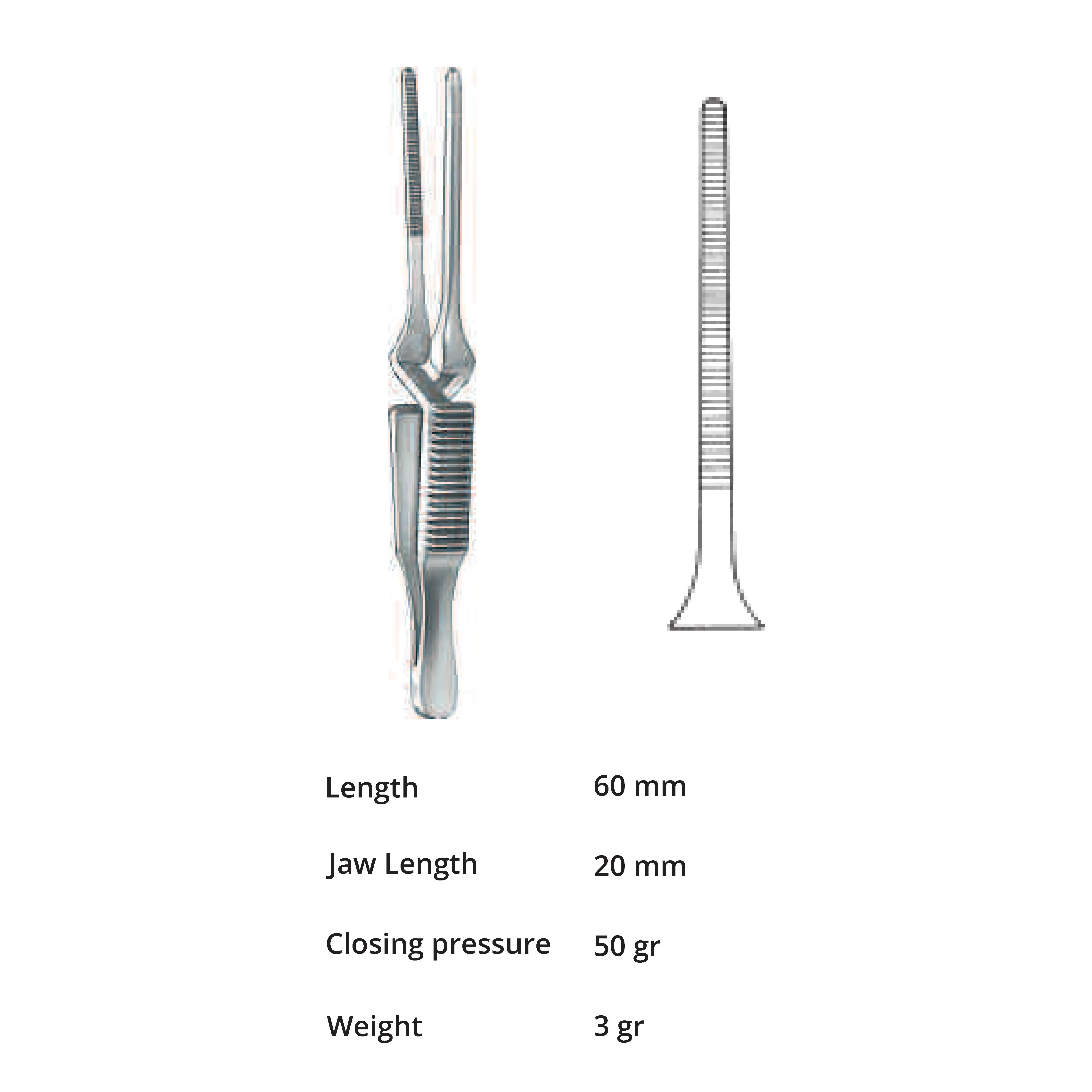 Length 60 mm, jaw length 20 mm, Pressure 50 g, weight 3 g