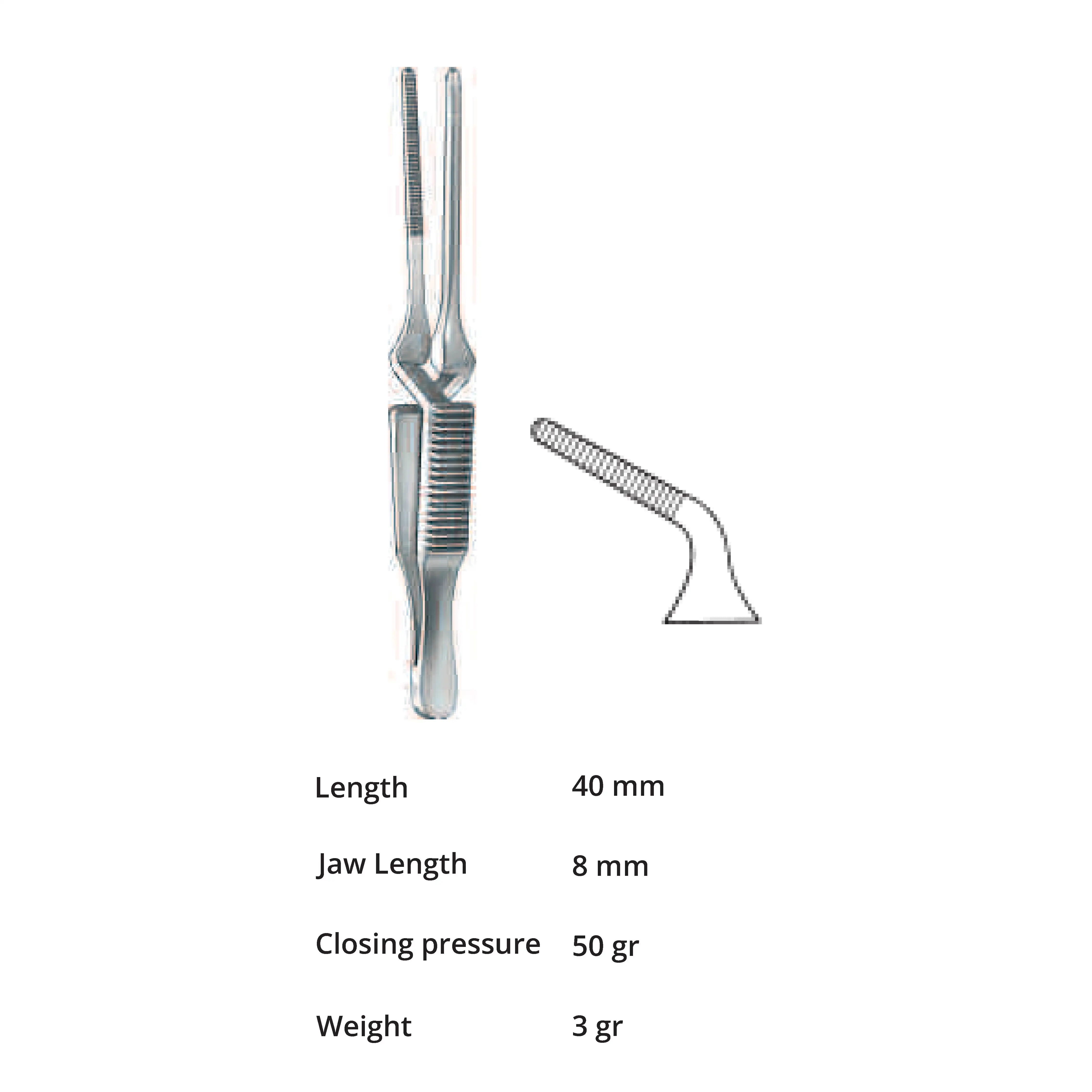 Length 40 mm, jaw length 8 mm, Pressure 50 g, weight 3 g