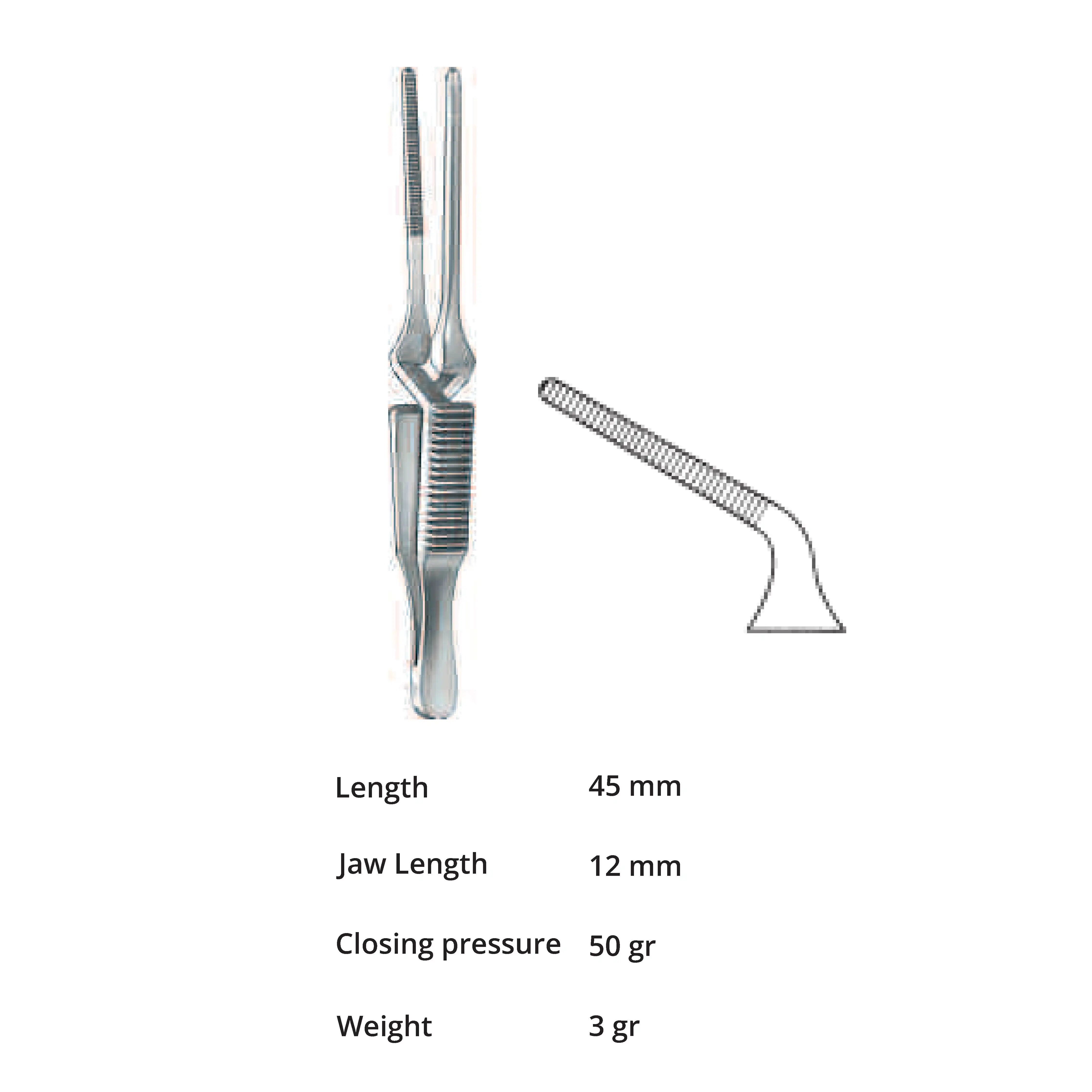 Length 45 mm, jaw length 12 mm, Pressure 50 g