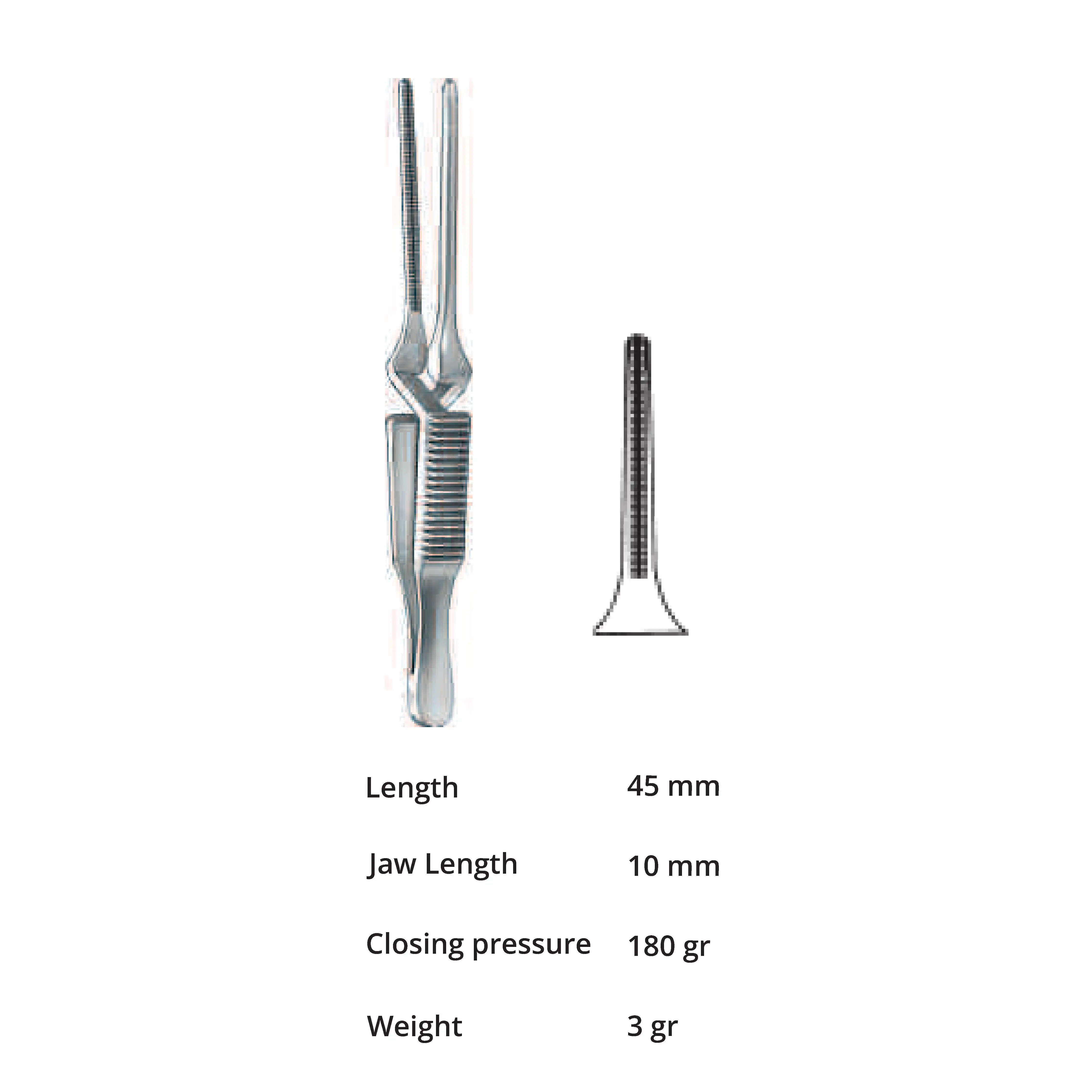 Length 45 mm, jaw length 10 mm, Pressure 180 g, weight 3 g