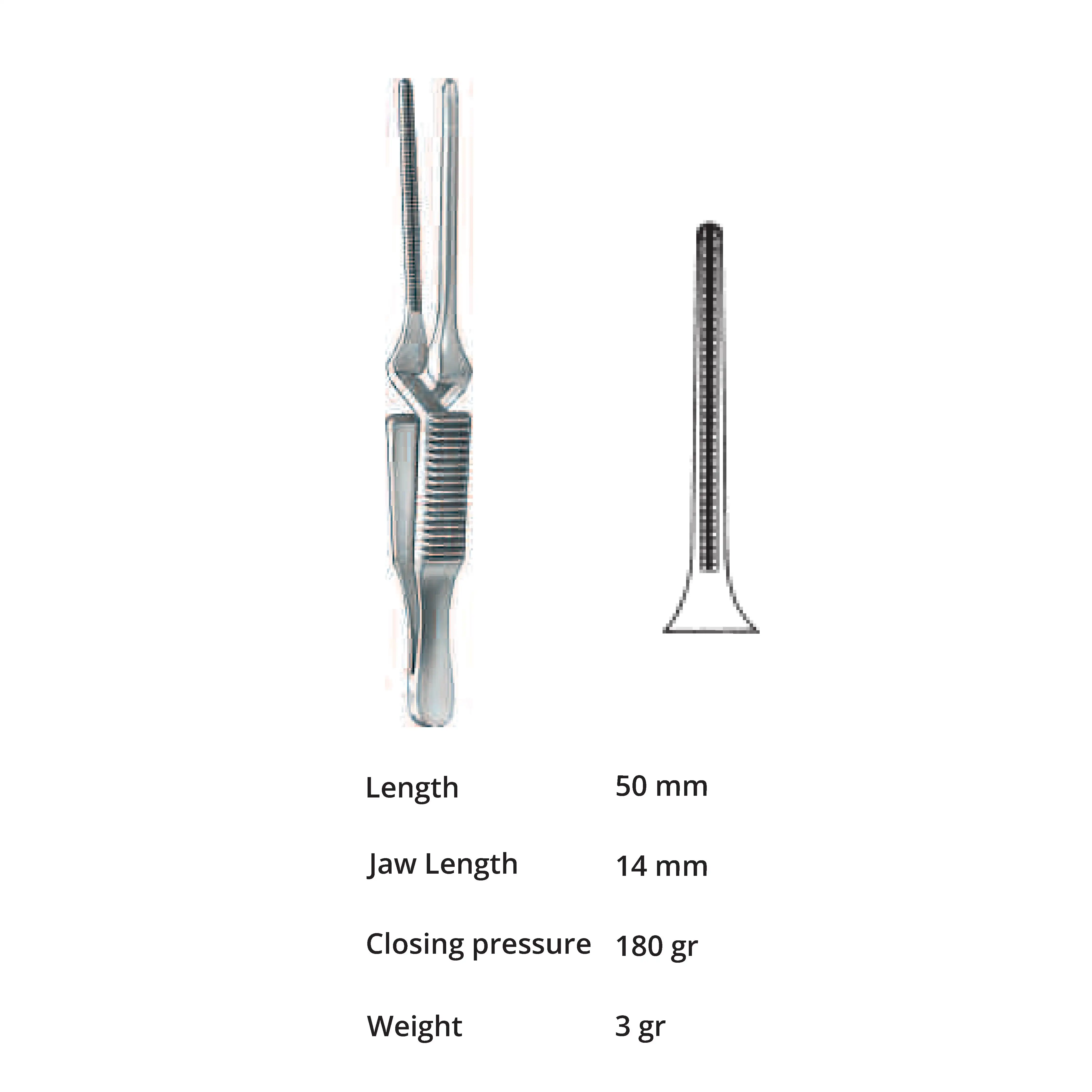 Length 50 mm, jaw length 14 mm, Pressure 180 g, weight 3 g