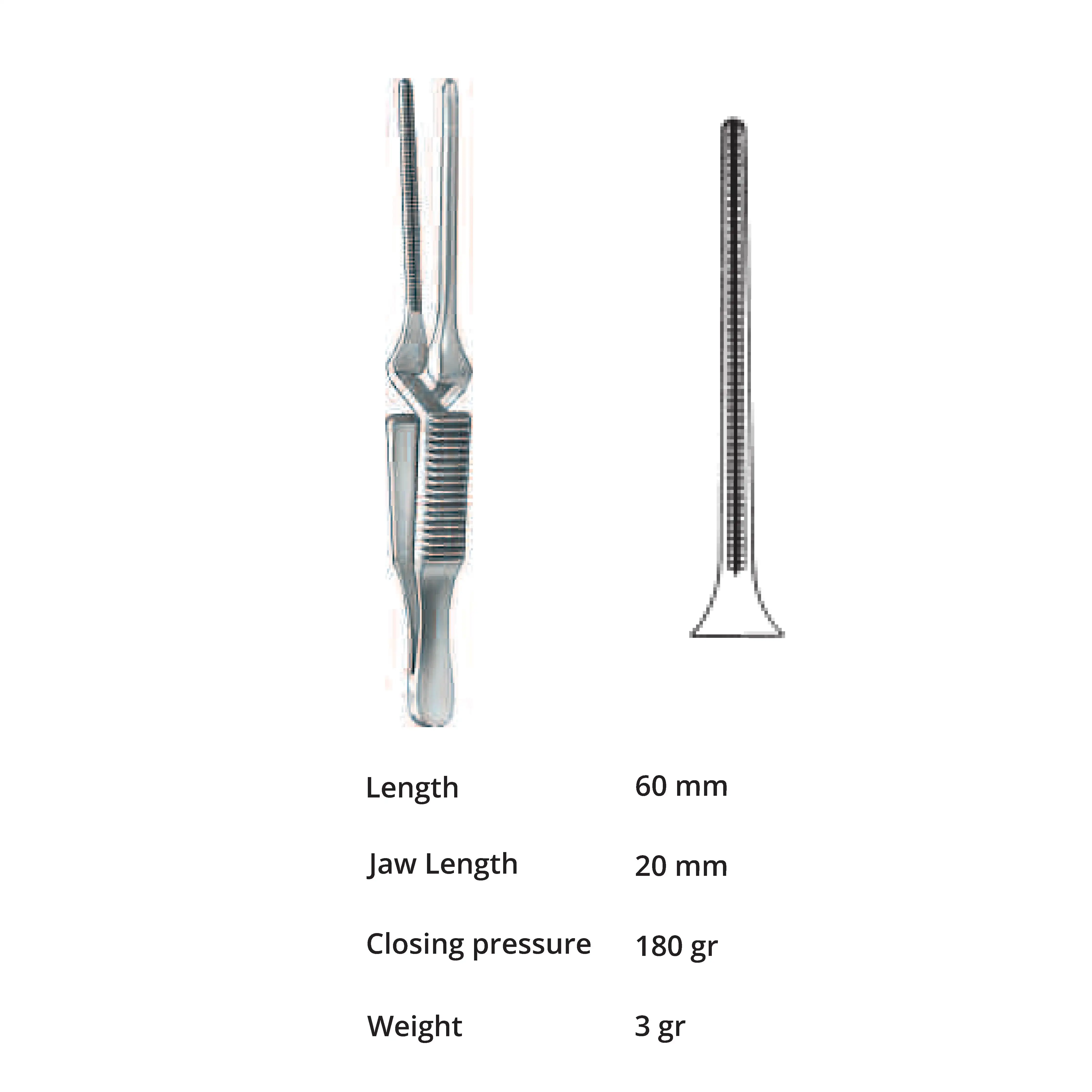 Length 60 mm, jaw length 20 mm, Pressure 180 g, weight 3 g