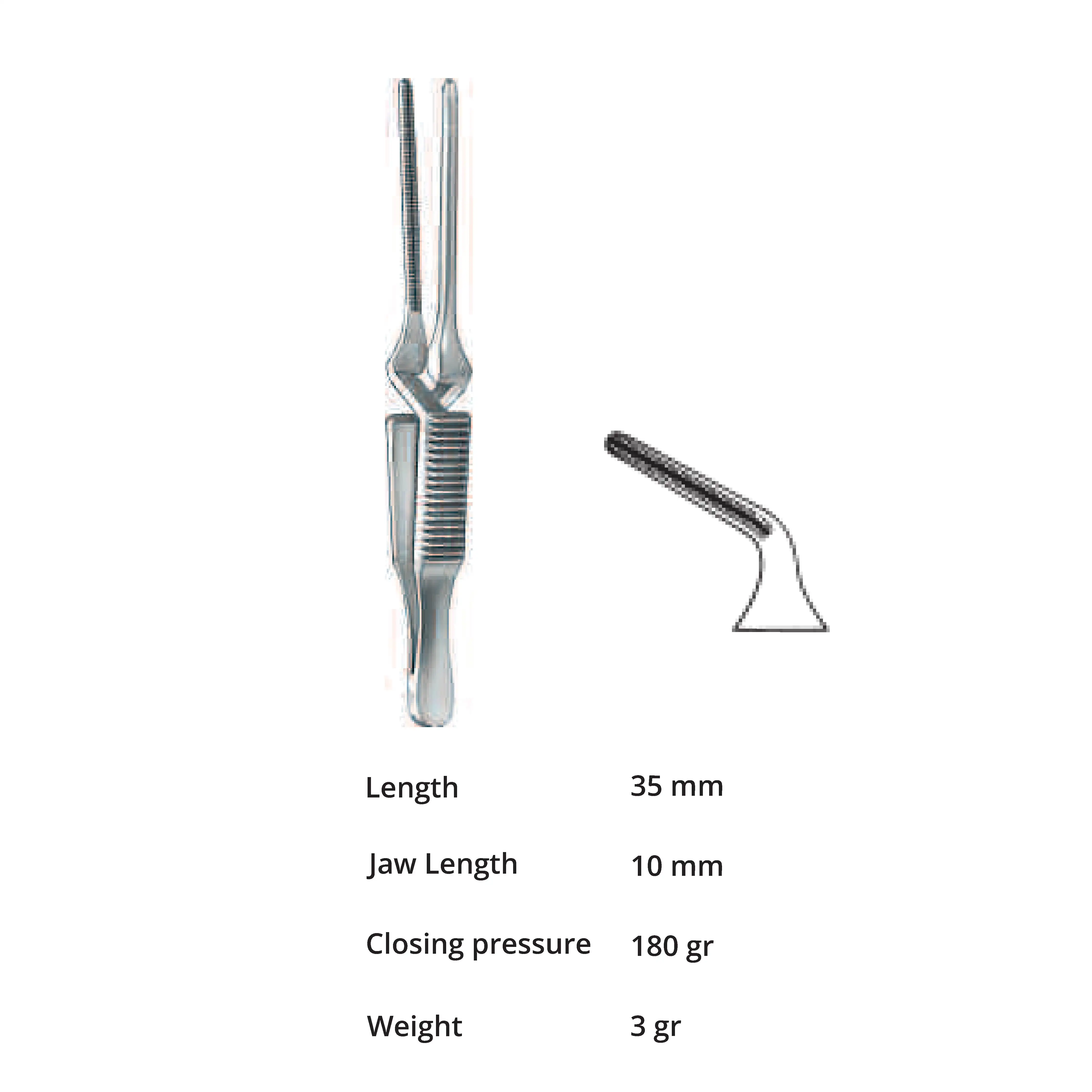 Length 35 mm, jaw length 10 mm, Pressure 180 g, weight 3 g