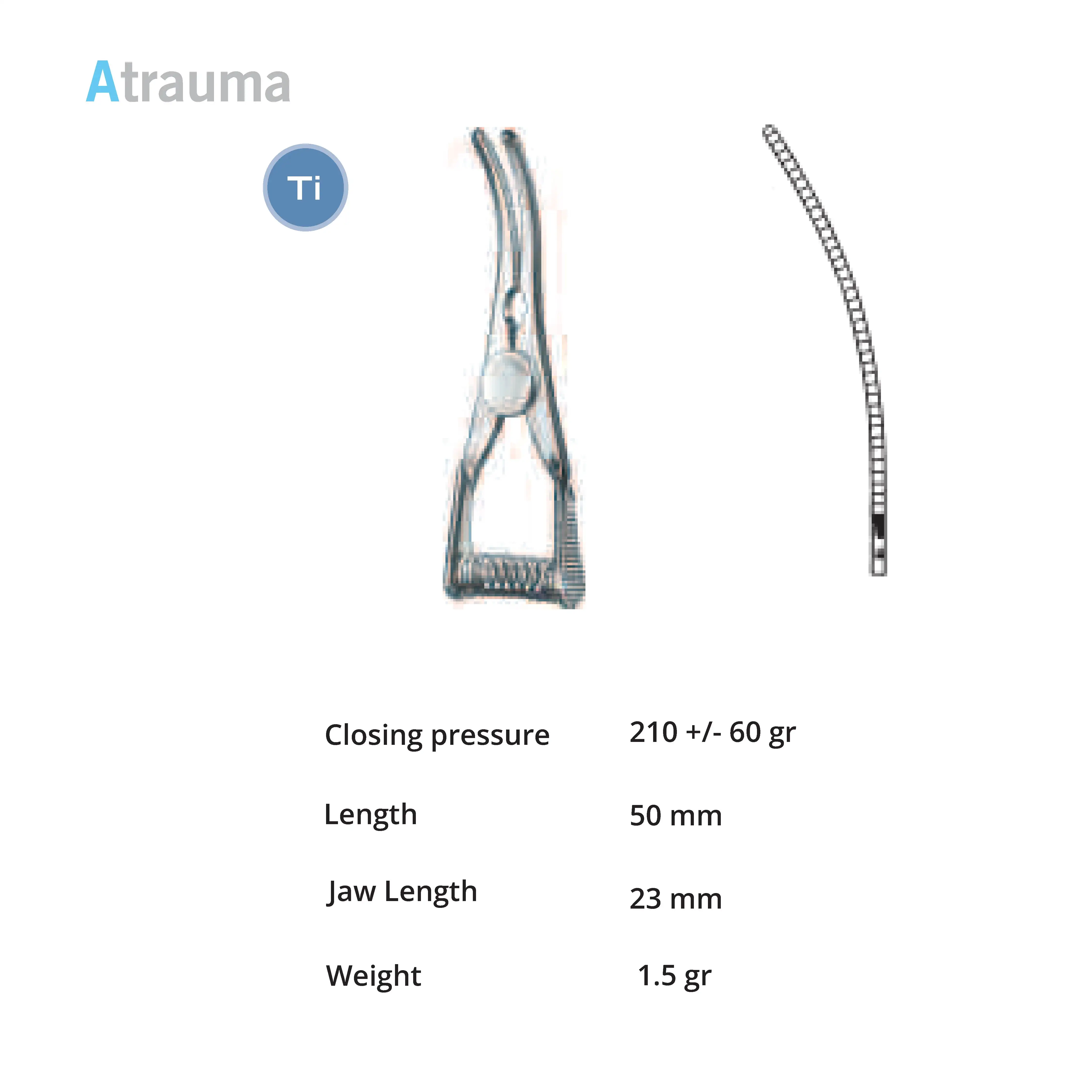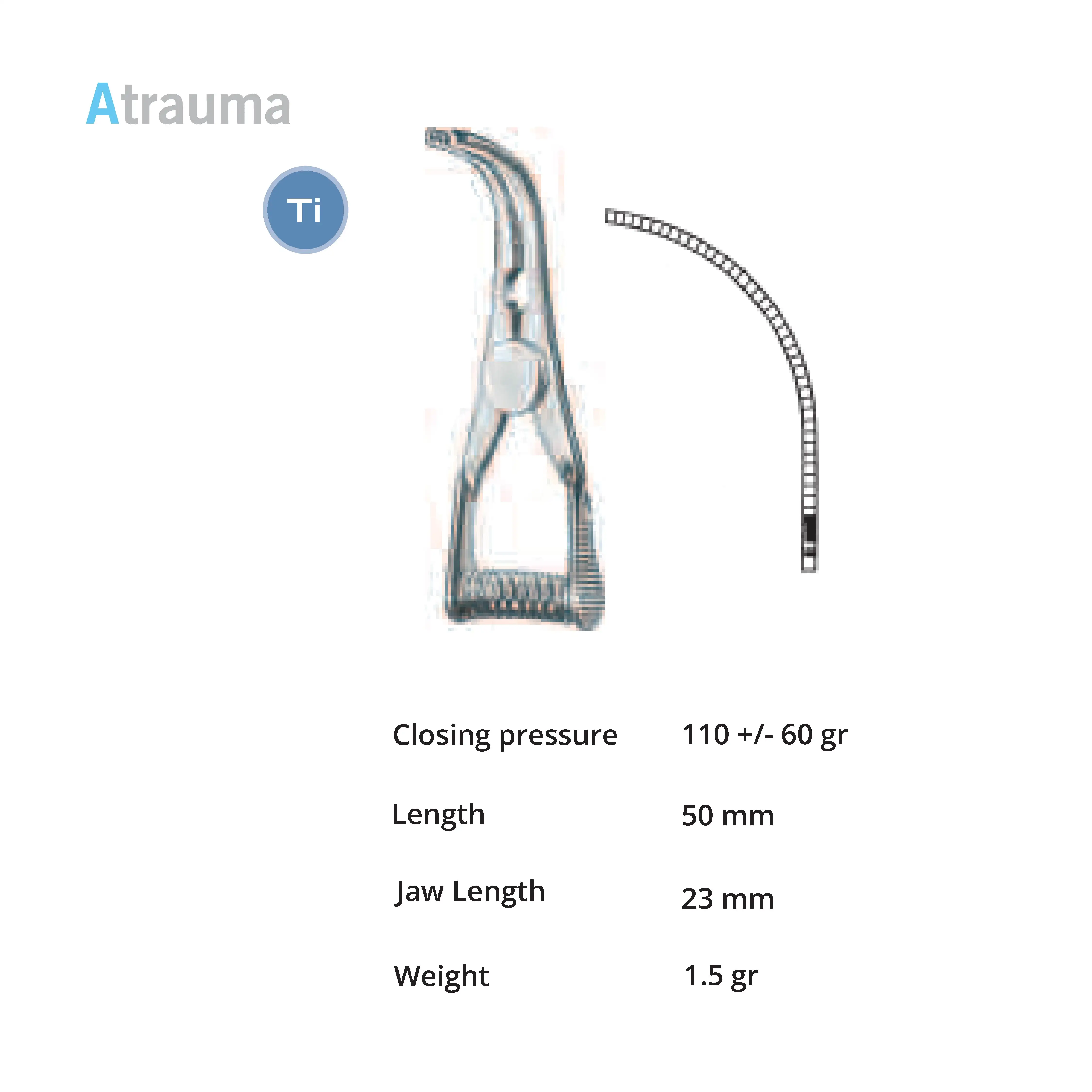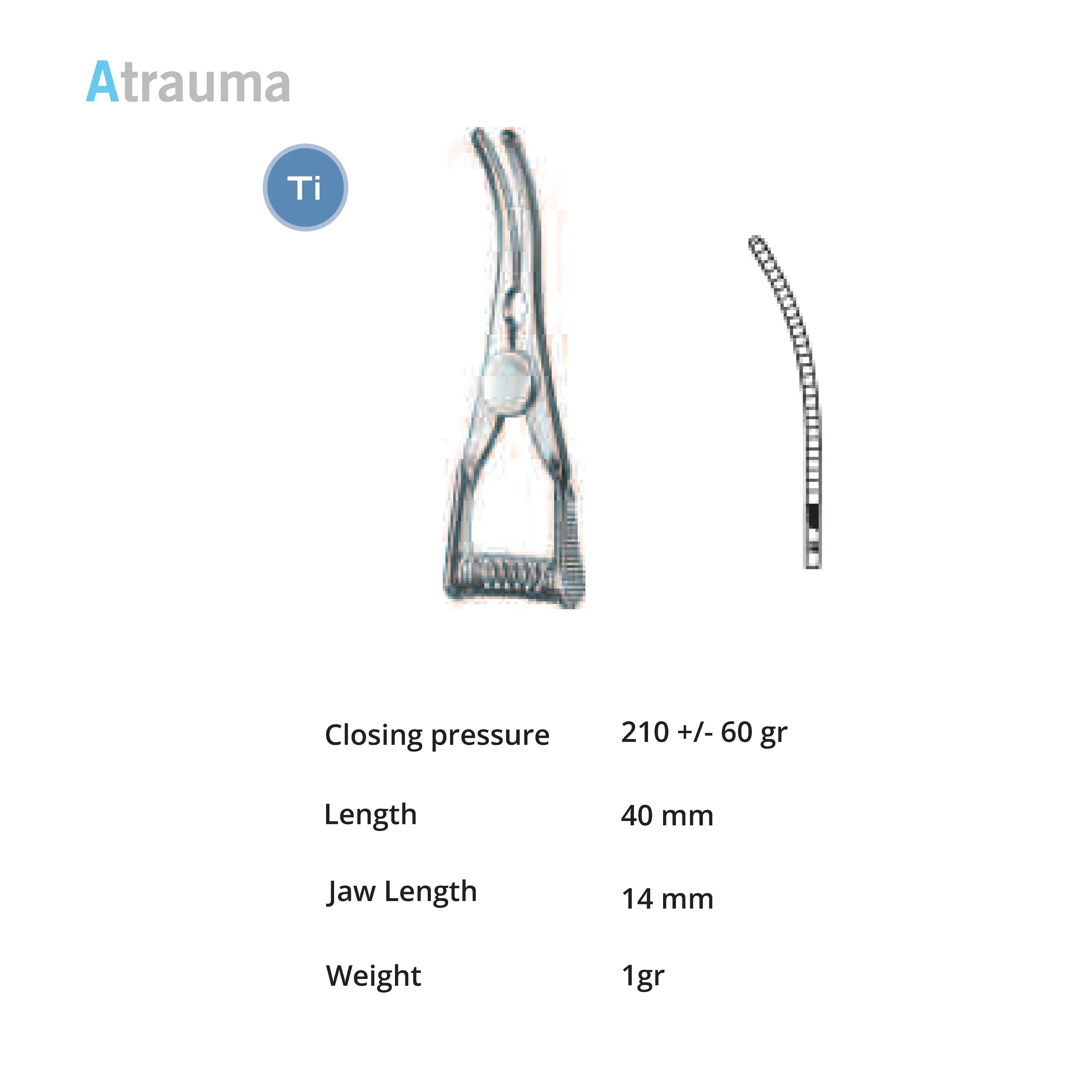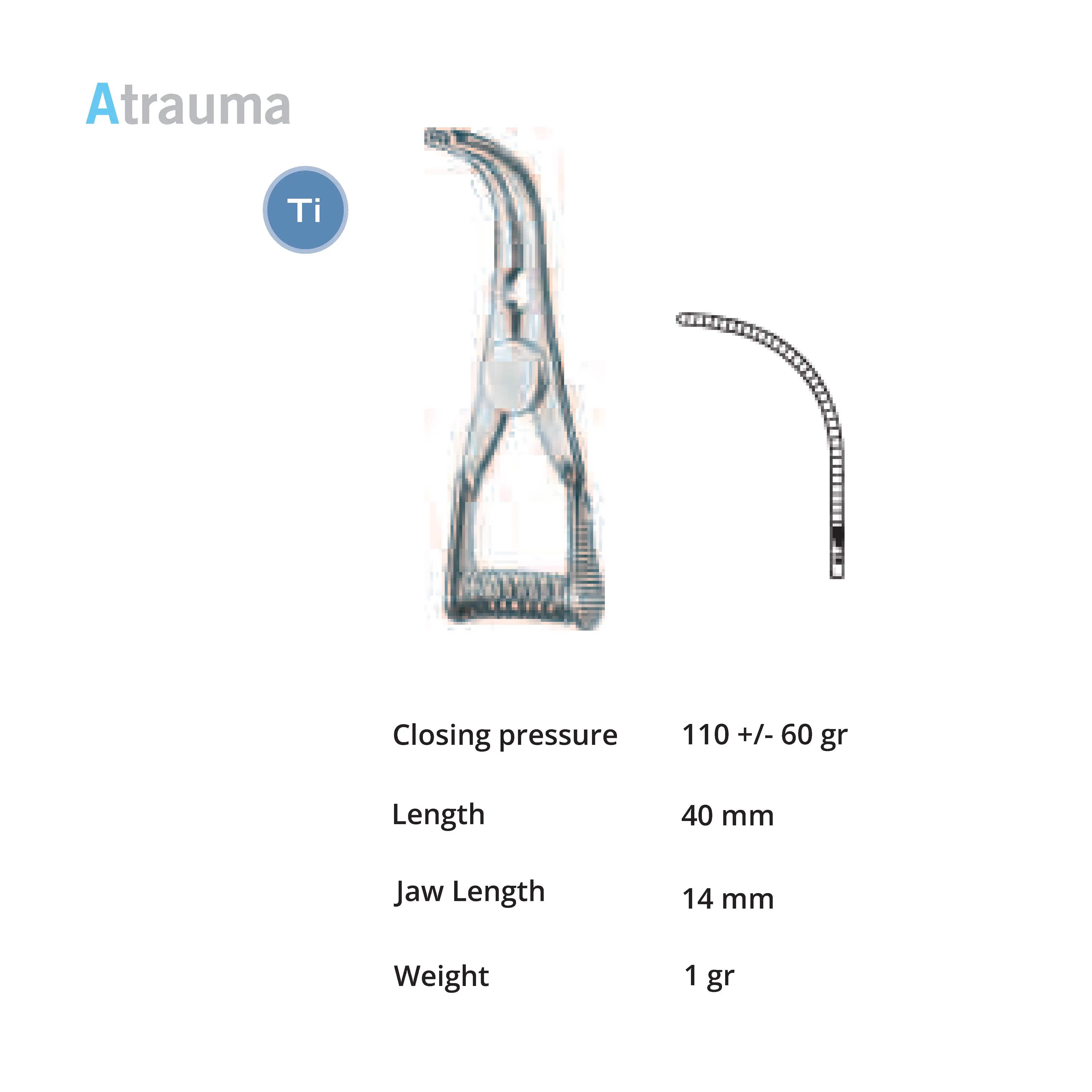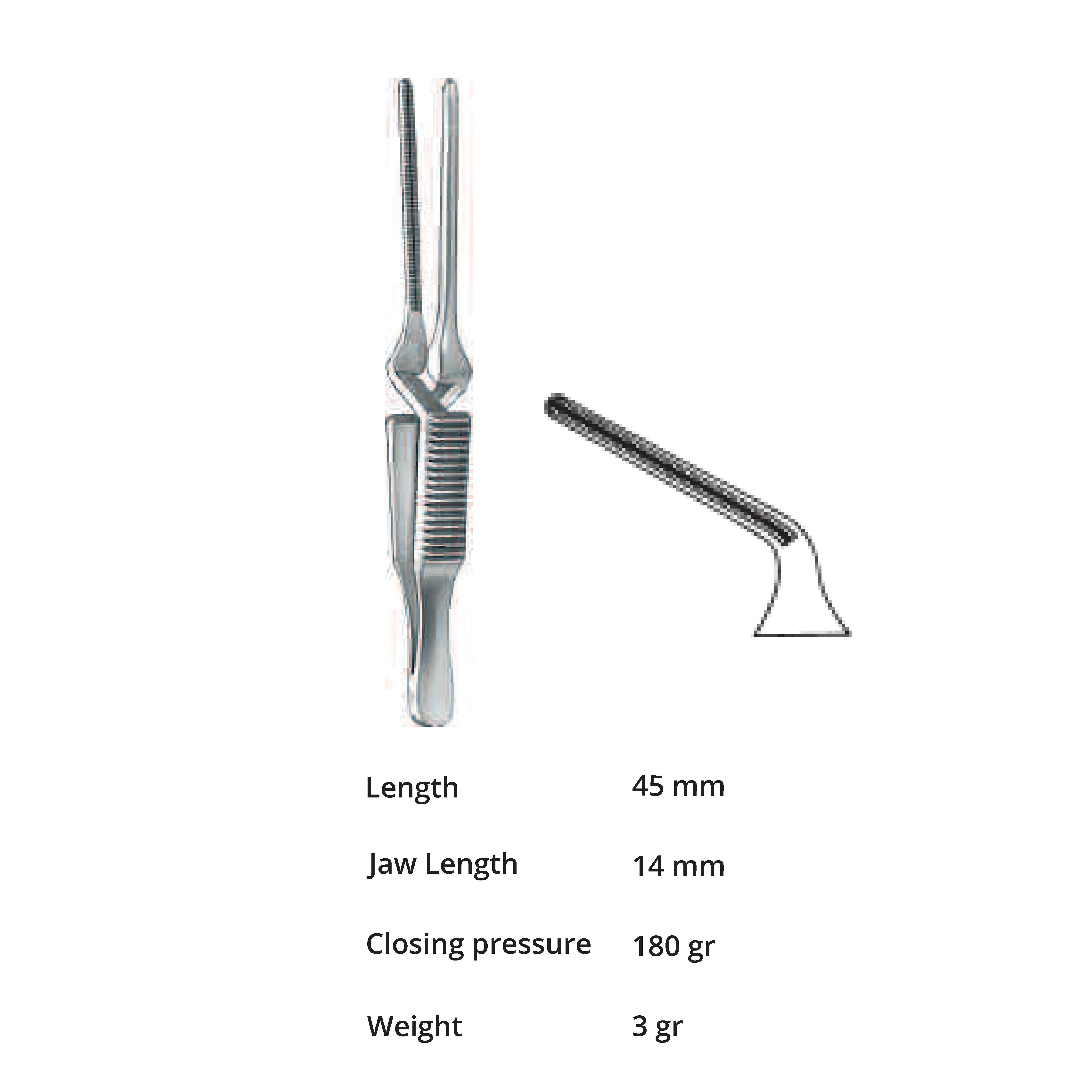 Length 45 mm, jaw length 14 mm, Pressure 180 g, weight 3 g