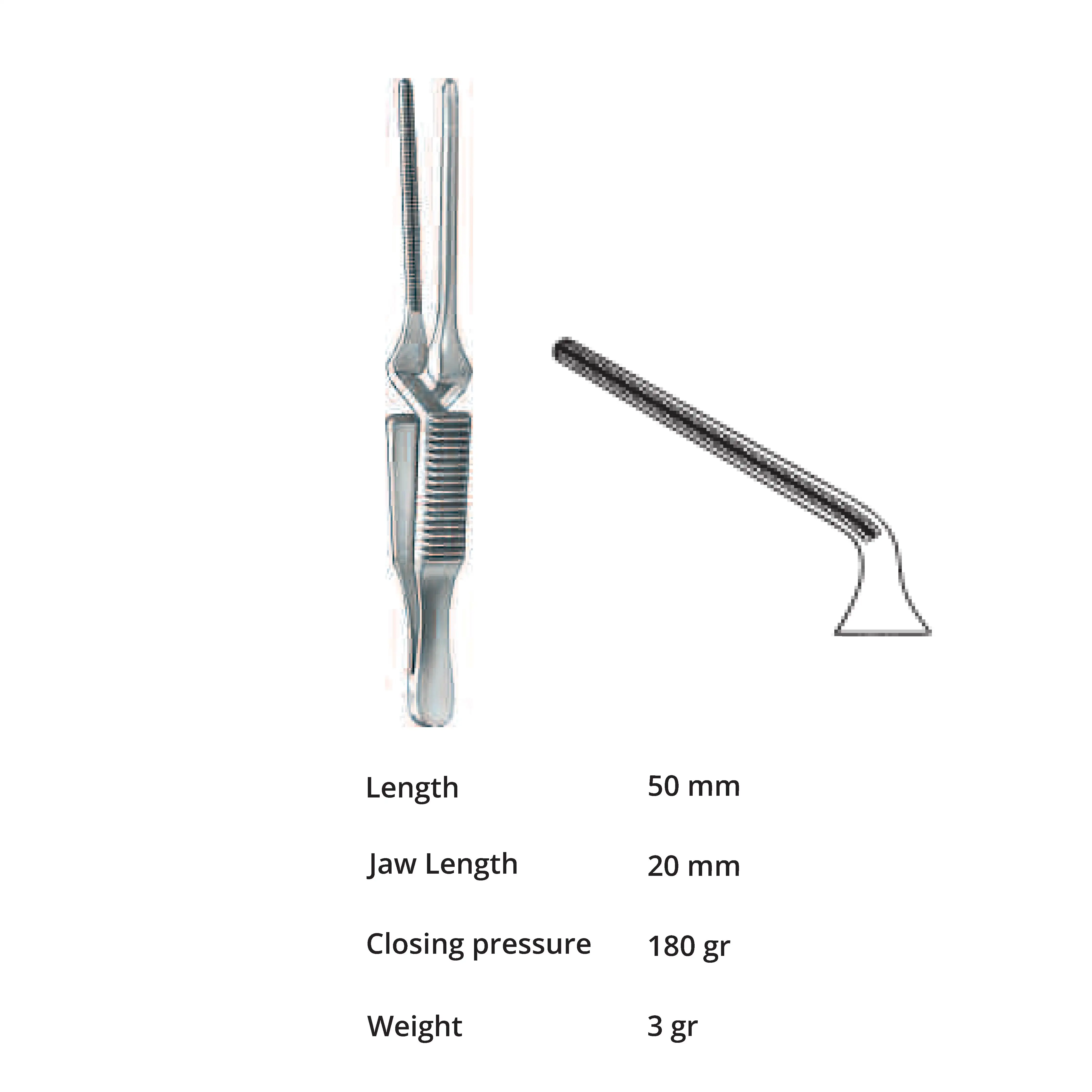 Length 50 mm, jaw length 20 mm, Pressure 180 g, weight 3 g