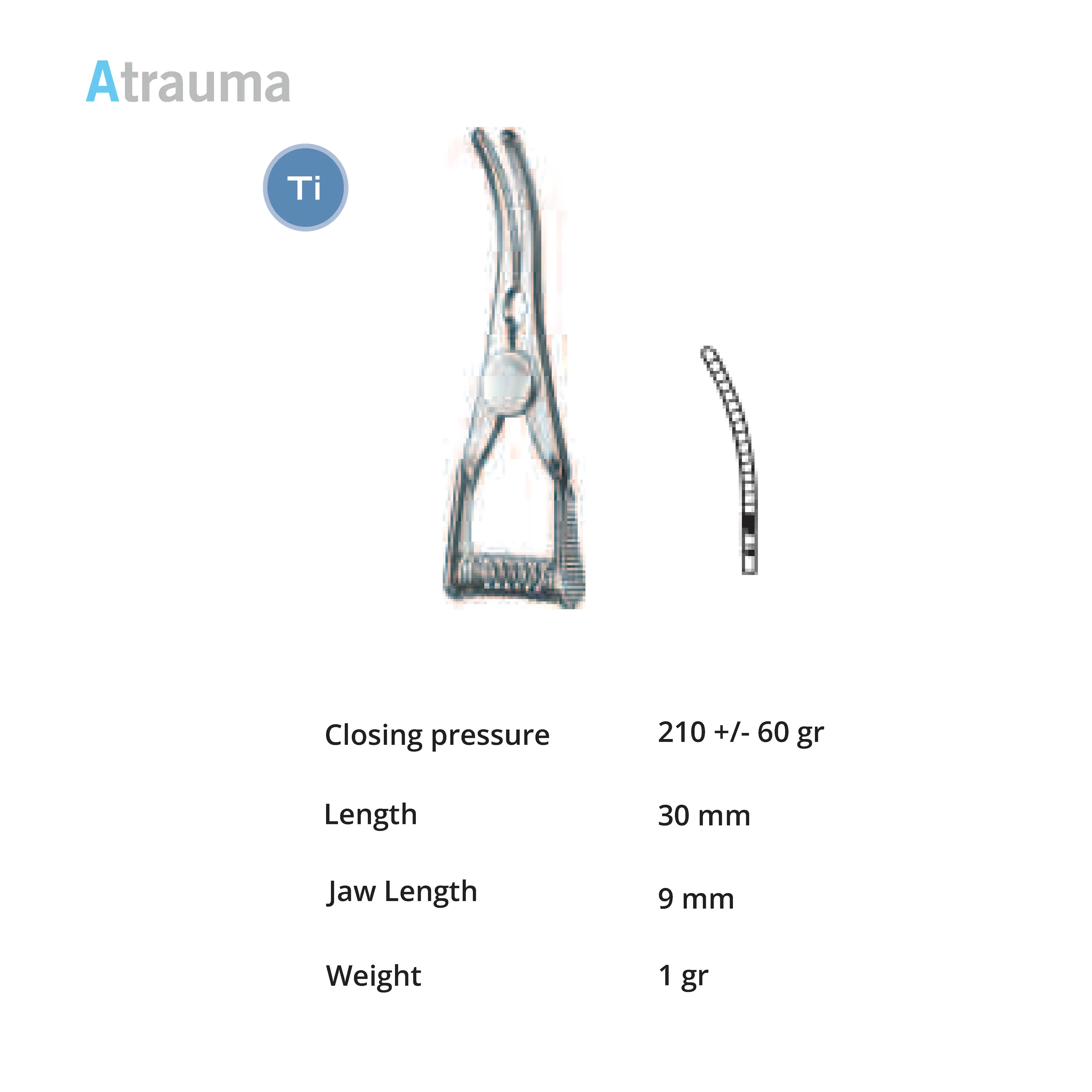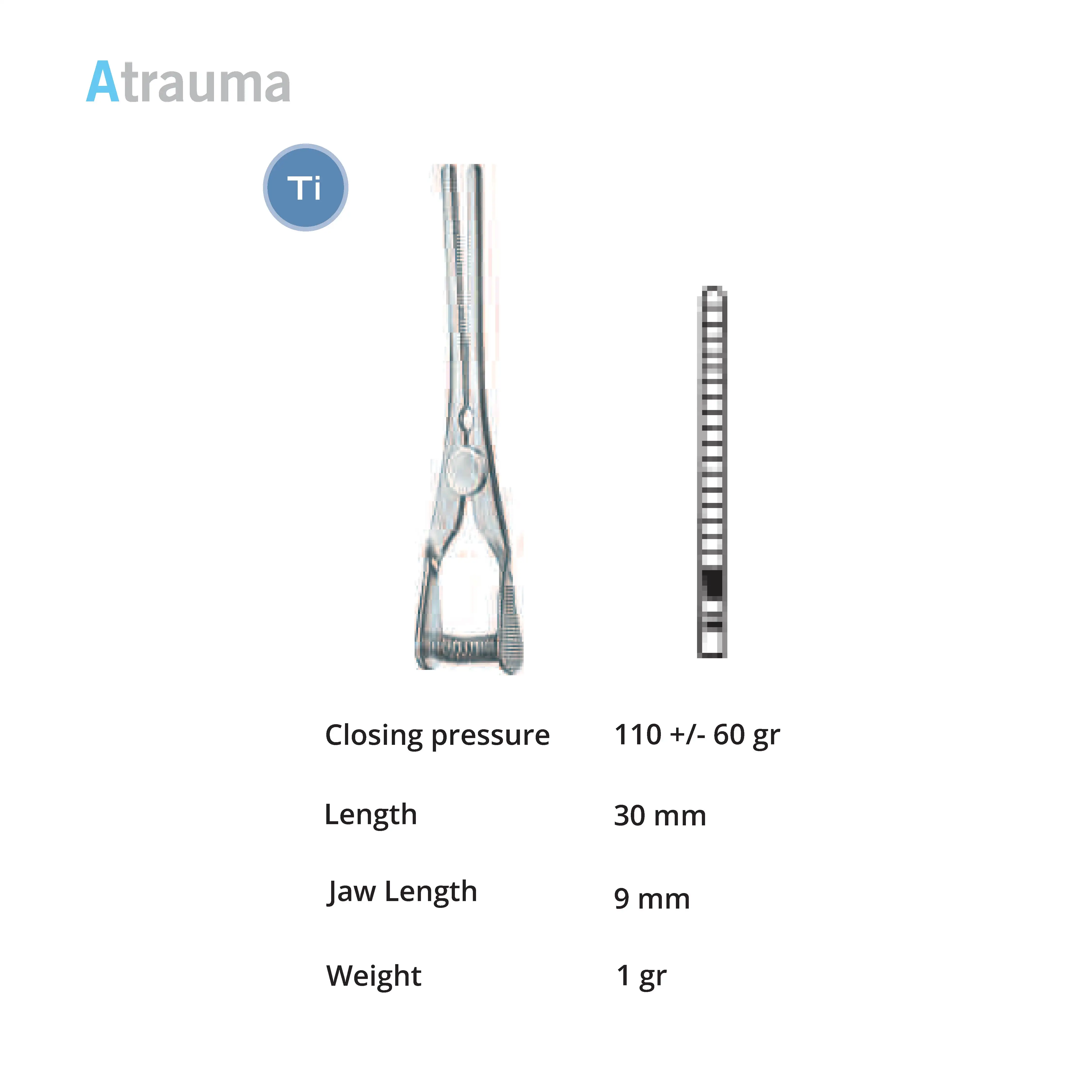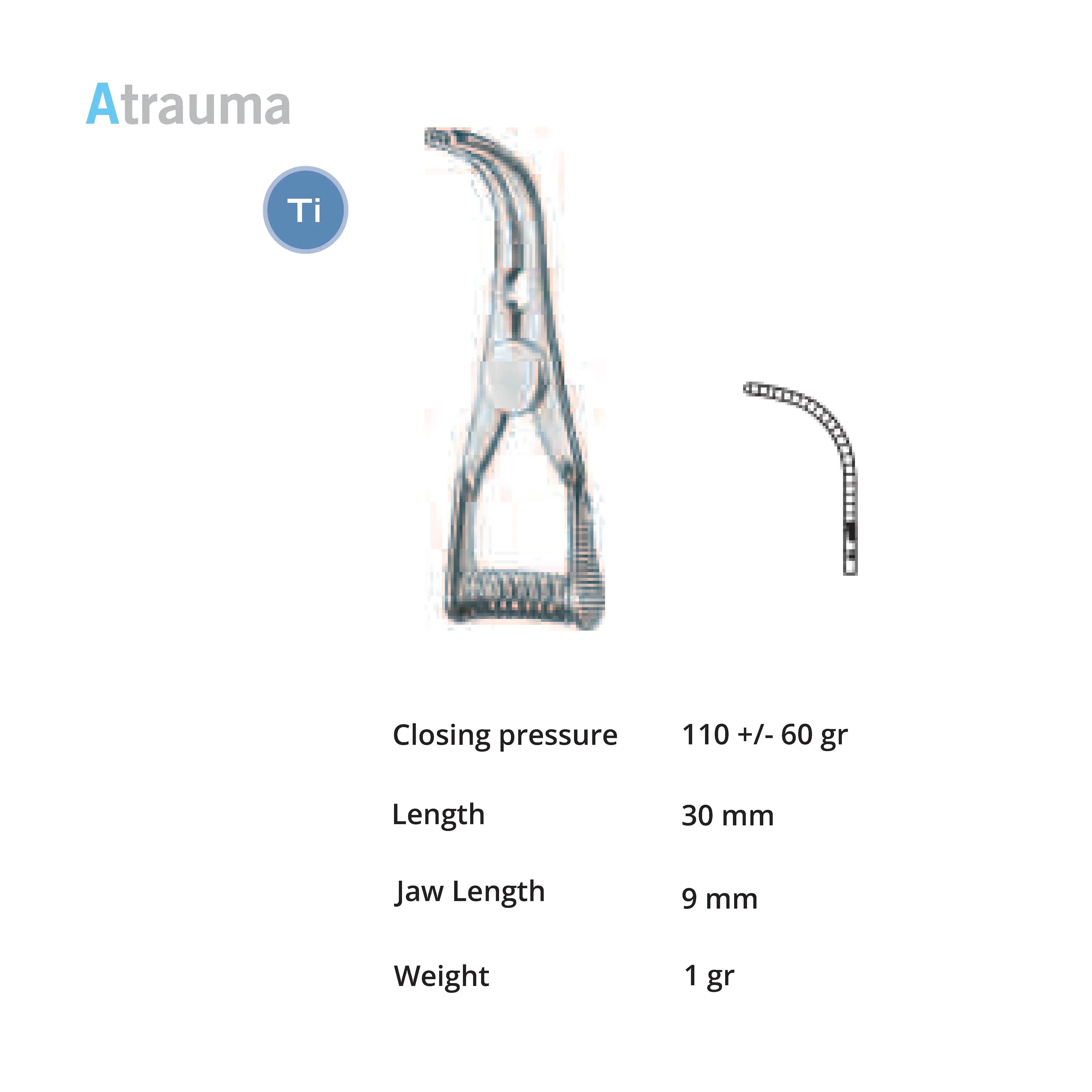 Pressure 110+/- 40 g, length 30 mm, jaw length 9 mm, weight 1 g